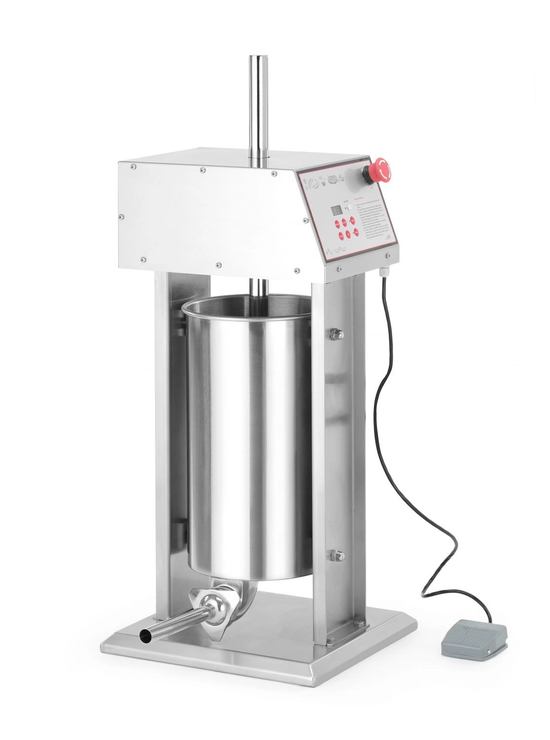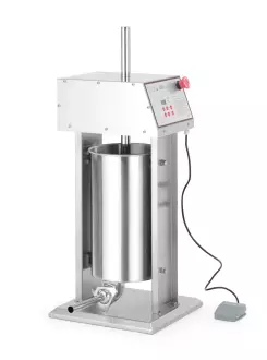 Elektrická vertikální plnička klobás s objemem 15 litrů. Vyrobeno z nerezové oceli. 4 nálevky o průměru 16, 22, 32 a 38 mm, které umožňují přípravu klobás různých tlouštěk.