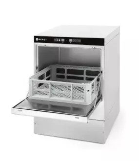 Hendi cateringová myčka skla určené k mytí skleněného nádobí, šálků, talířů aakutů. Pouzdro z nerezové oceli AISI 304. Elektromechanické ovládání. Oboustranná pevná dvířka. Mycí cyklus trvá přibližně 120 sekund. Mytí nádobí probíhá při teplotě přibližně 62ºC, zatímco oplachování – při teplotě přibližně 85ºC. Spotřeba vody je 2-2,5 litru na jeden mycí cyklus. Kapacita je až 30 košů/h. Oddělená mycí a oplachovací ramena z nerezové oceli.