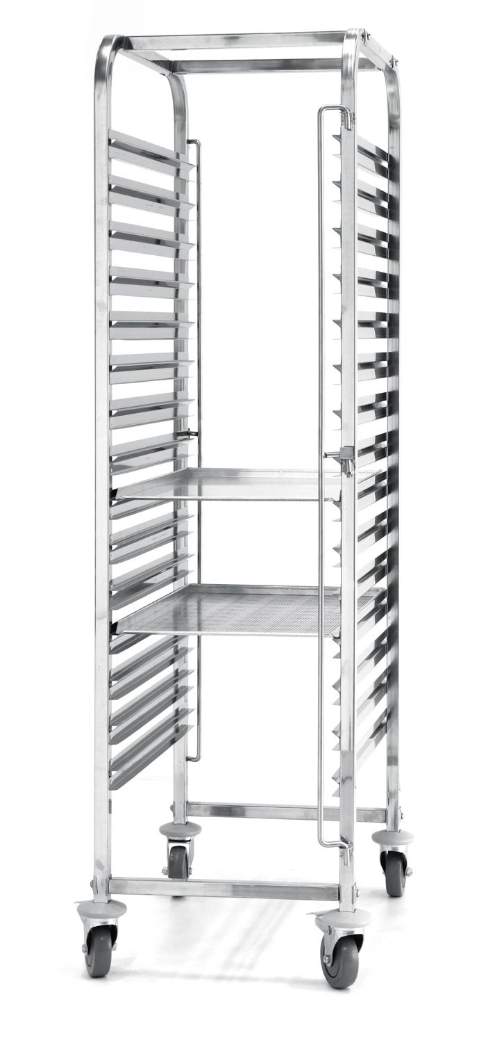 Wózek z nerezové oceli pro přepravu pečicích plechů. Vozík vyžaduje vlastní montáž. 4 otočná kolečka (z toho 2 s brzdou). Oboustranná ochrana proti vypadnutí pečicích plechů. Vzdálenost mezi jednotlivými úrovněmi je 8 cm. Kapacita wózky 15 pečicích plechů 60x40 cm.
