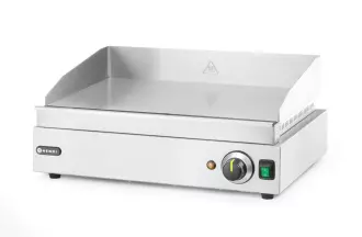 Grilovací deska s chromovanou pracovní plochou Tloušťka 9 mm. Hladký pracovní povrch. Kryt - nerezová ocel. Dvě nezávisle řízené topné zóny. Kontrolka zabraňující náhodnému kontaktu s varnou deskou. Vyjímatelný zásobník na tuk a zbytky. Stupňovitá regulace teploty až do 300 °CoC. Ochrana proti přehřátí. Lze použít pro nepřetržitý provoz.
