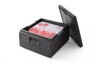 Izolovaná termální nádoba na přepravu nebo skladování pizzy o objemu 21 litrů z pěnového polypropylenu EEP. Tělo a víko v černé barvě. Nádoba má ergonomická přepravní madla.