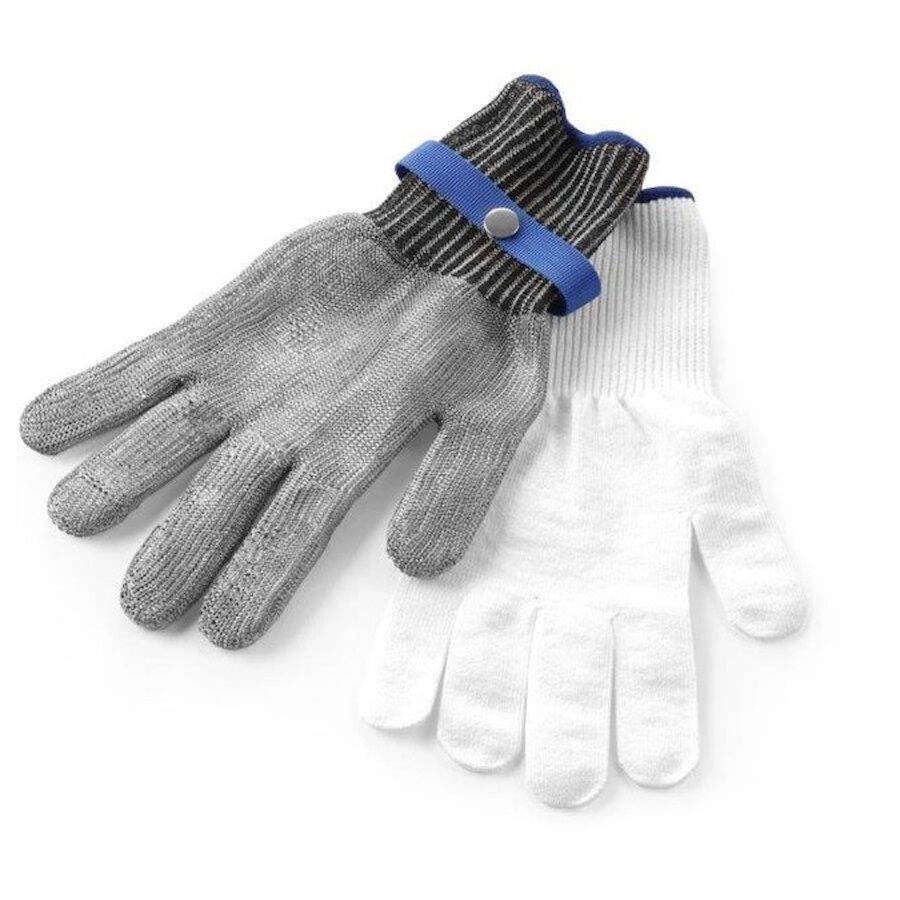 Balení 2 rukavic, vnitřní bavlněné a vnější z nerezové oceli pro styk s potravinami. Rukavice jsou vhodné pro levou i pravou ruku.