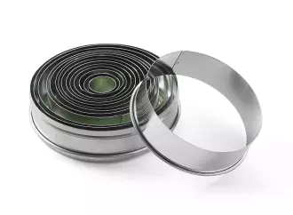Kulatá forma řezu, hladký. Sada 14 kusů. Průměr od 1,9 do 11,2 cm. Formičky nejsou vhodné do myčky nádobí.