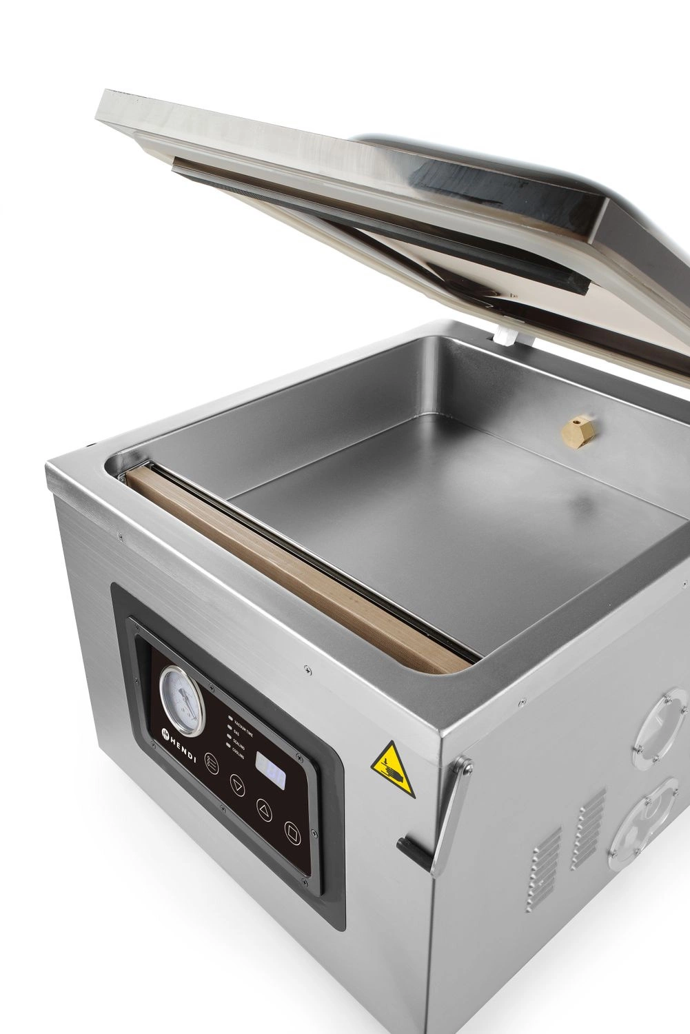 Komorový balicí automat Profi Line 410. Nastavitelná doba generování próžnia a utěsňování, plnění, chlazení. Možnost provozu na automatické nebo ruční ovládání. Možnost balení tekutin a potravin s vysokým obsahem vody. Digitální displej a analogový tlakoměr. Pouzdro a komora jsou vyrobeny z vysoce kvalitní nerezové oceli. Dno s velkou prohlubní a vypouklým průhledným víkem umožňuje balení velkých porcí. Svorka uvnitř komory pro uchycení sáčku.