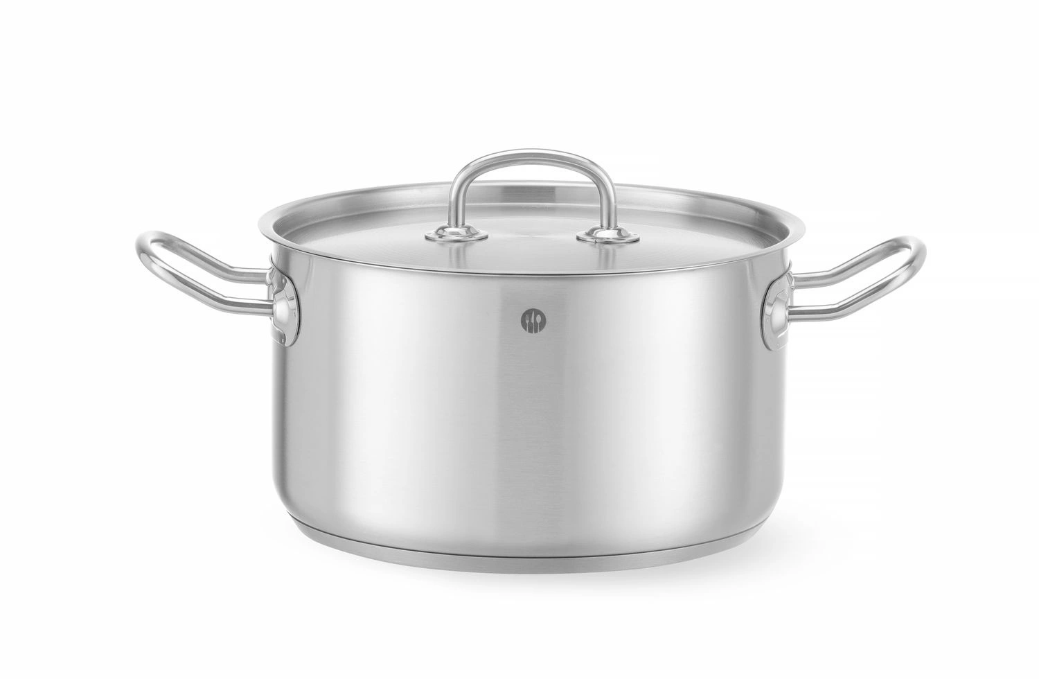 Profesionální KITCHEN LINE střední hrnec Určeno pro použití v gastronomii. Hrnec je vyroben z nerezové oceli se saténovou povrchovou úpravou. Masivní vícebodové rukojeti hrnce se nezahřívají a zajišťují maximální bezpečnost při používání. Kapsle, vVícevrstvé silné sendvičové dno (ocel-hliník-ocel) zajišťuje rovnoměrné rozložení tepla, čímž se zkracuje doba vaření. Dno vařiče je pod vysokým tlakem a teplem přitaveno k tělu, právě to zajišťuje, že se dno nedeformuje, nepraská ani neláme a dokonale rozvádí teplo. Technologie nárazového lepení zajišťuje dokonalé spojení vrstev a zaručuje odolnost proti korozi a optimální vedení tepla. Speciální spodní upevnění umožňuje lepší přenos tepla.