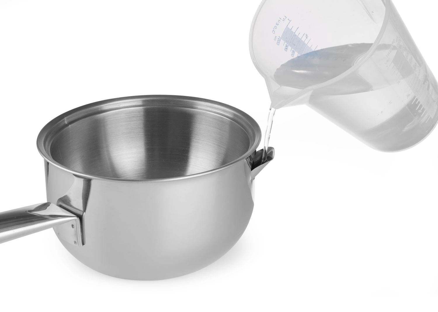 Rondel z nerezové oceli o objemu 1 l. Má dvojité stěny se zásobníkem na vodu, který zabraňuje připalování tekutin. Je vybavena nezahřívací rukojetí a praktickou nálevkou pro doplňování vody.