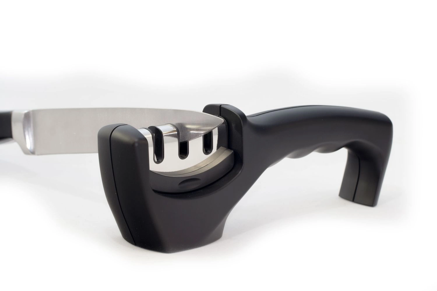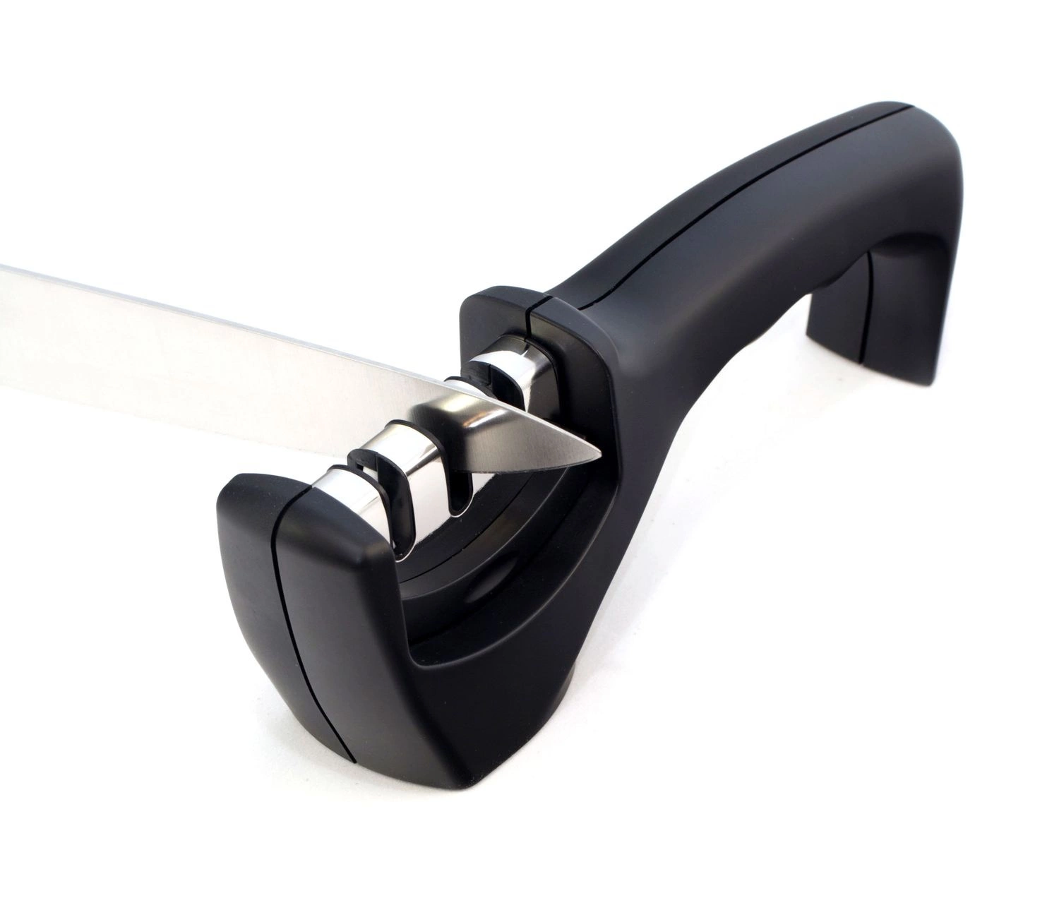 Univerzální brousek na nože. Ergonomická rukojeť a protiskluzová základna zajišťují bezpečnost a pohodlí při používání. 3 funkce umožňují broušení všech typů nožů, také keramických. Nepoužívejte k ostření zubatých nožů nebo nůžek.