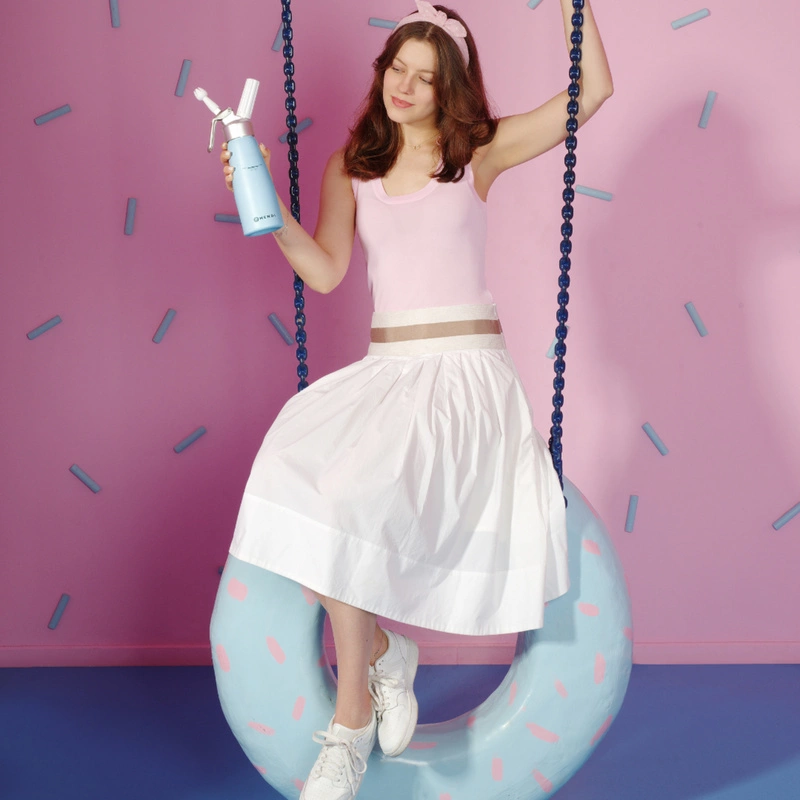 Sifon pro přípravu šlehačky a krémy, omáčky a pěny. Vyrobeno výhradně z hliníku. Barva pouzdra modrá - edice Kurt Scheller. Nelze v něm připravovat horké omáčkyów.