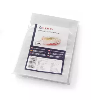 Sáčky pro komorový balicí stroj. Vyrobeno z vícevrstvé bariérové fólie: PAPE nylon/polyethylen o tloušťce 65 mikronů&ndash. Sáčky pouze pro primární balení a skladování v chladicích a mrazicích boxech – nejsou vhodné pro tepelné zpracování v troubách.