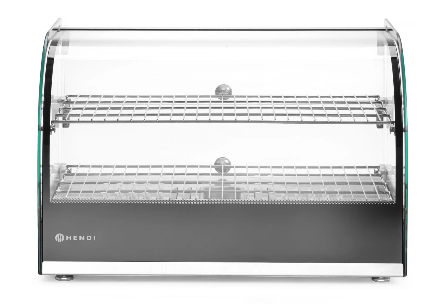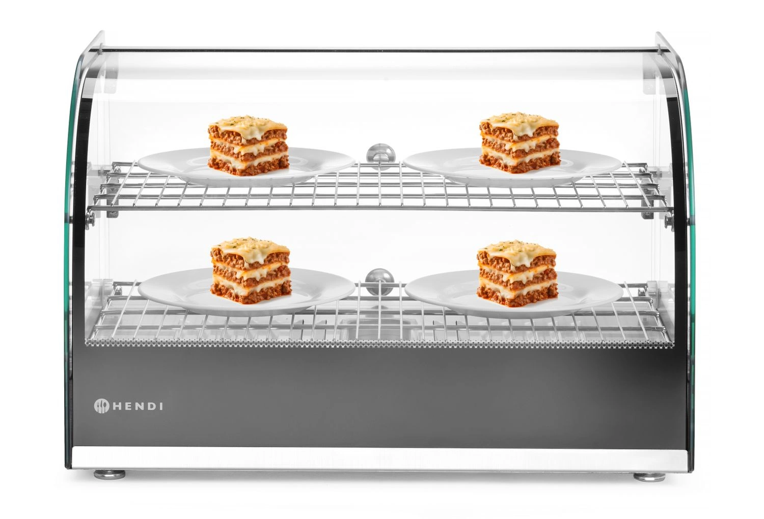 Topná vitrína dvoupatrová z tvrzeného skla. Kryt z nerezové oceli. Zaoblené přední okno. Snadný přístup do vnitřku vitríny přes velké skleněné okno v zadní části jednotky. Infračervená topná tělesa. Vyjímatelný tácek na drobky pro snadné čištění vitríny.