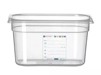 GN 1/4 kontejner HACCP s hloubkou 15 cm z průhledného polypropylenu. Vlisovaný štítek pro sledování procesu skladování. Nepohlcuje pachyóa příchutěóa.