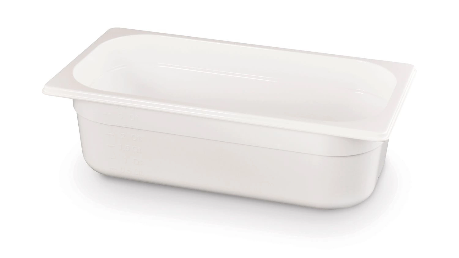 GN 1/3 kontejner o hloubce 10 cm z bílého polykarbonátu. Nepohlcuje příchutě ani pachy. Teplotní odolnost od -40 do +99oC.