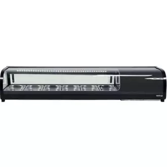Chladicí vitrína na sushi 6x1/3 GN. Dodává se s 6 nerezovými nádobami GN 1/3. Posuvná dvířka z tvrzeného skla umožňují přístup do přihrádky. Zaoblené přední sklo rovněž z tvrzeného skla, nad nímž je LED osvětlení. Chladivo R600a, teplotní rozsah 0-12 o C. Statické chlazení s funkcí automatického odmrazování. Elektrický regulátor s ukazatelem teploty.