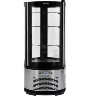 Kruhová chladicí vitrína s kapacitou 100 l. Vyrobena z vysoce kvalitních materiálů. Ideální pro vystavování dortů a zákusků. Součástí vybavení jsou 3 police z tvrzeného skla s nastavitelnou výškou. Přístup do vitríny je zajištěn skleněnými dvířky z tvrzeného skla s funkcí samočinného zavírání. Vitrína je vybavena LED osvětlením. Chladicí agregát využívá chladivo 600a. Zařízení je vybaveno elektronickým ovladačem s digitálním displejem teploty.