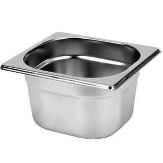 - GN 1/6 – standardní rozměr používaný v gastronomii, který umožňuje snadné sladění nádoby s dalšími nádobami a kuchyňskými zařízeními, jako jsou bain-marie, chladničky nebo konvektomaty. Díky tomu je nádoba univerzální a všestranně použitelná.