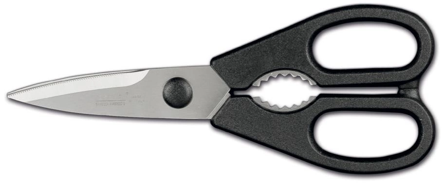 Univerzální kuchyňské nůžky Ambrogio Sanelli z nerezové oceli AISI 420, tvrdost 54-55 HRC. Čepele mají na ostří jemné zoubkování. V rukojeti mají další vroubkované hrany pro loupání ořechůów. Rozebíratelné na dvě části, snadno se čistí.