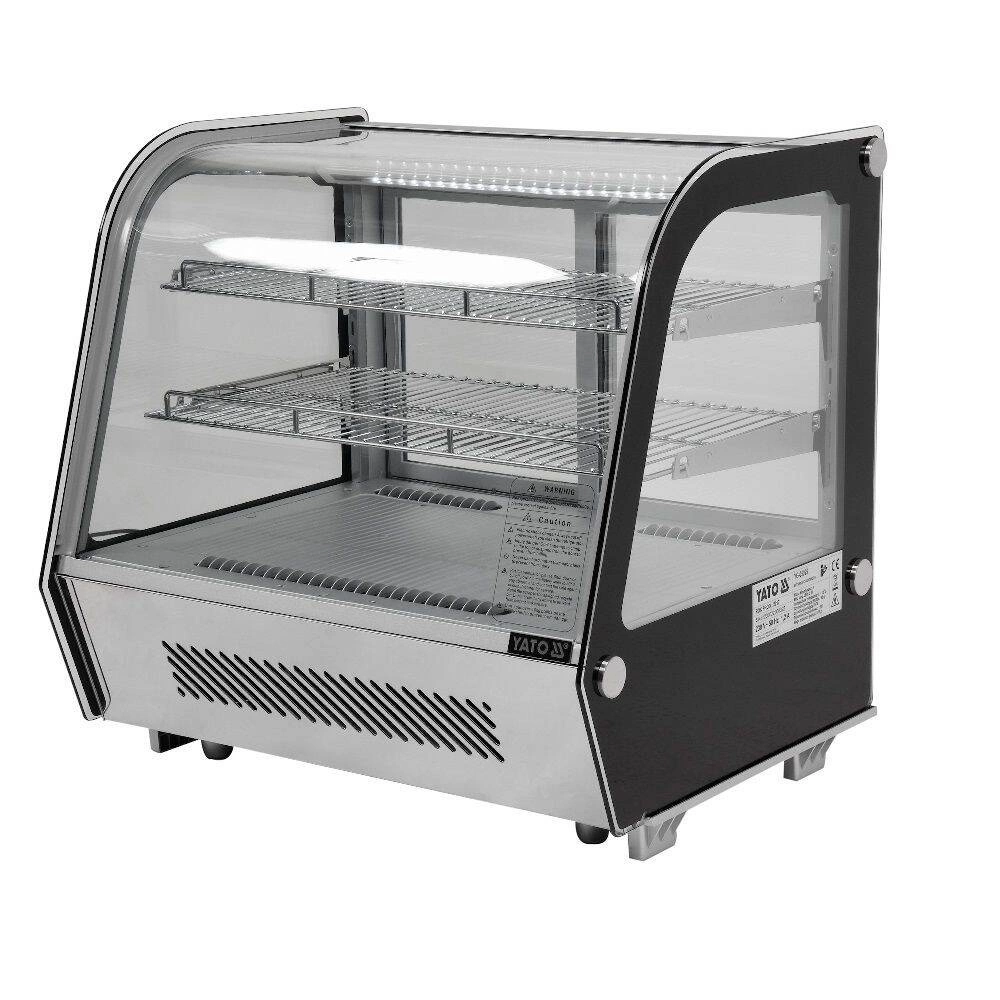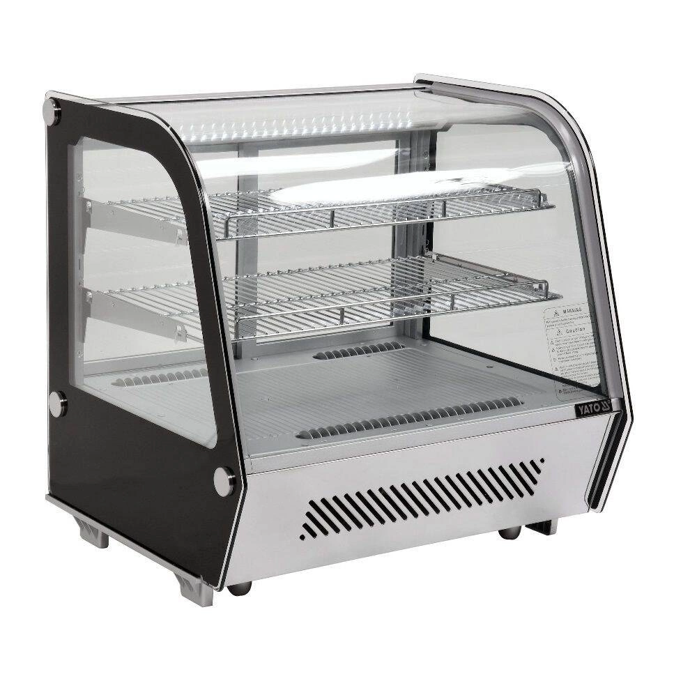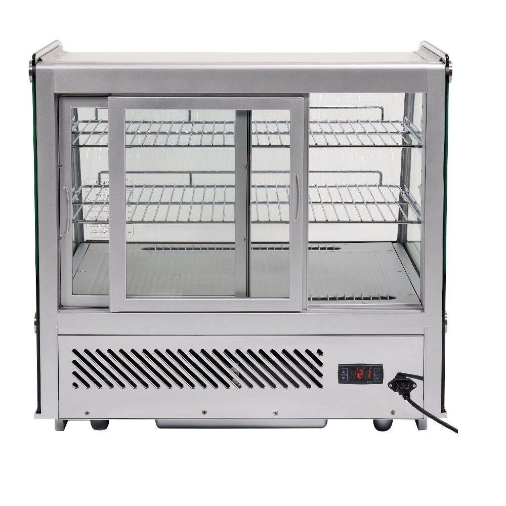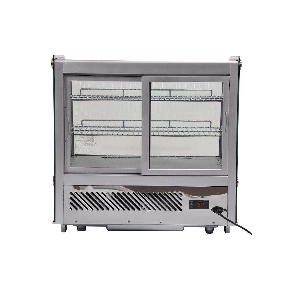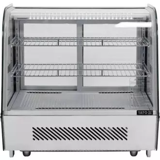 Chladicí vitrína expoziční prosklená ze 4 stran o objemu 120 l. Stříbrná barva. Vyrobena z vysoce kvalitních surovin. Ideální pro vystavování produktů jako jsou dorty, zákusky, mini občerstvení. Součástí jsou dvě potažené police s možností nastavení výšky, což umožňuje umístění produktů různých rozměrů. Přístup do vitríny je zajištěn pomocí posuvných skleněných dvířek, která jsou vyrobena z tvrzeného skla, stejně jako zaoblené přední sklo a boční skla – díky tomu jsou velmi odolná a mají dobré izolační vlastnosti. Vitrína je vybavena LED osvětlením, které umožňuje ještě atraktivnější prezentaci produktů.