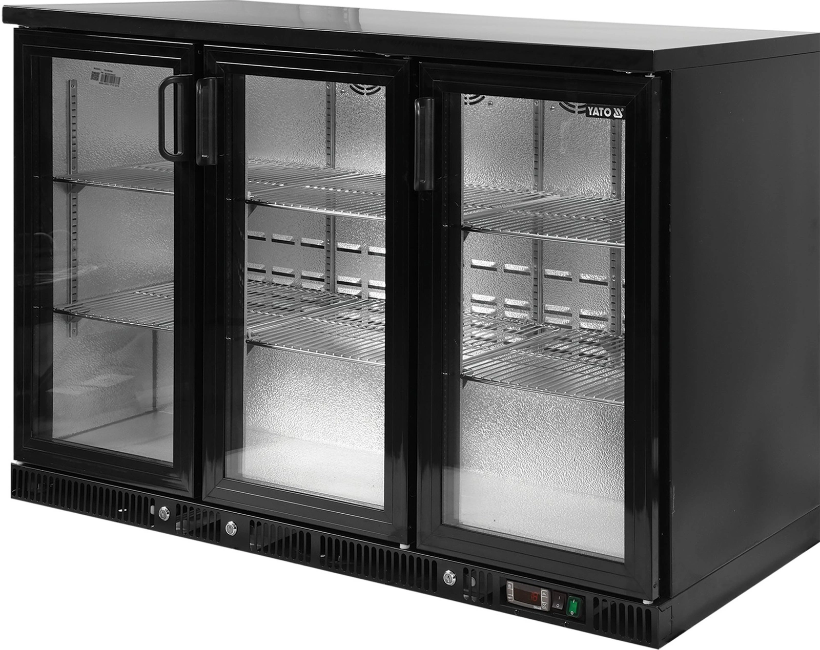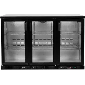 Chladnička prosklená s křídlovými dveřmi pro skladování a vystavování lahví. Celkový objem 341 l. Plášť je vyroben z práškově lakované oceli v černé barvě. Vnitřní stěny jsou vyrobeny z hliníku. 3 posuvné, samouzavírací dveře z tvrzeného skla jsou vybaveny zámkem na klíč, který chrání před krádeží. Součástí vybavení je 6 chromovaných polic s maximální nosností 40 kg – při rovnoměrném zatížení. Chladicí agregát o výkonu 255 W využívá chladivo R600a, je určen pro provoz ve 4. klimatické třídě – při maximální okolní teplotě 30o C a relativní vlhkosti 55 %. Zařízení je vybaveno elektronickým ovladačem s digitálním displejem teploty.