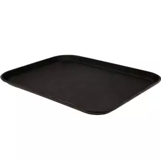 Protiskluzový číšnický podnos Obdélníkový tvar o rozměrech 46x35,5 cm. Černá barva. Vícevrstvá skleněná vlákna použitá ve vaničce zaručují vysokou tuhost a mechanickou pevnost. Zásobník má okraje, které chrání výrobky před vypadnutím. Podnos je ideální pro použití v hotelech, restauracích a barech.
