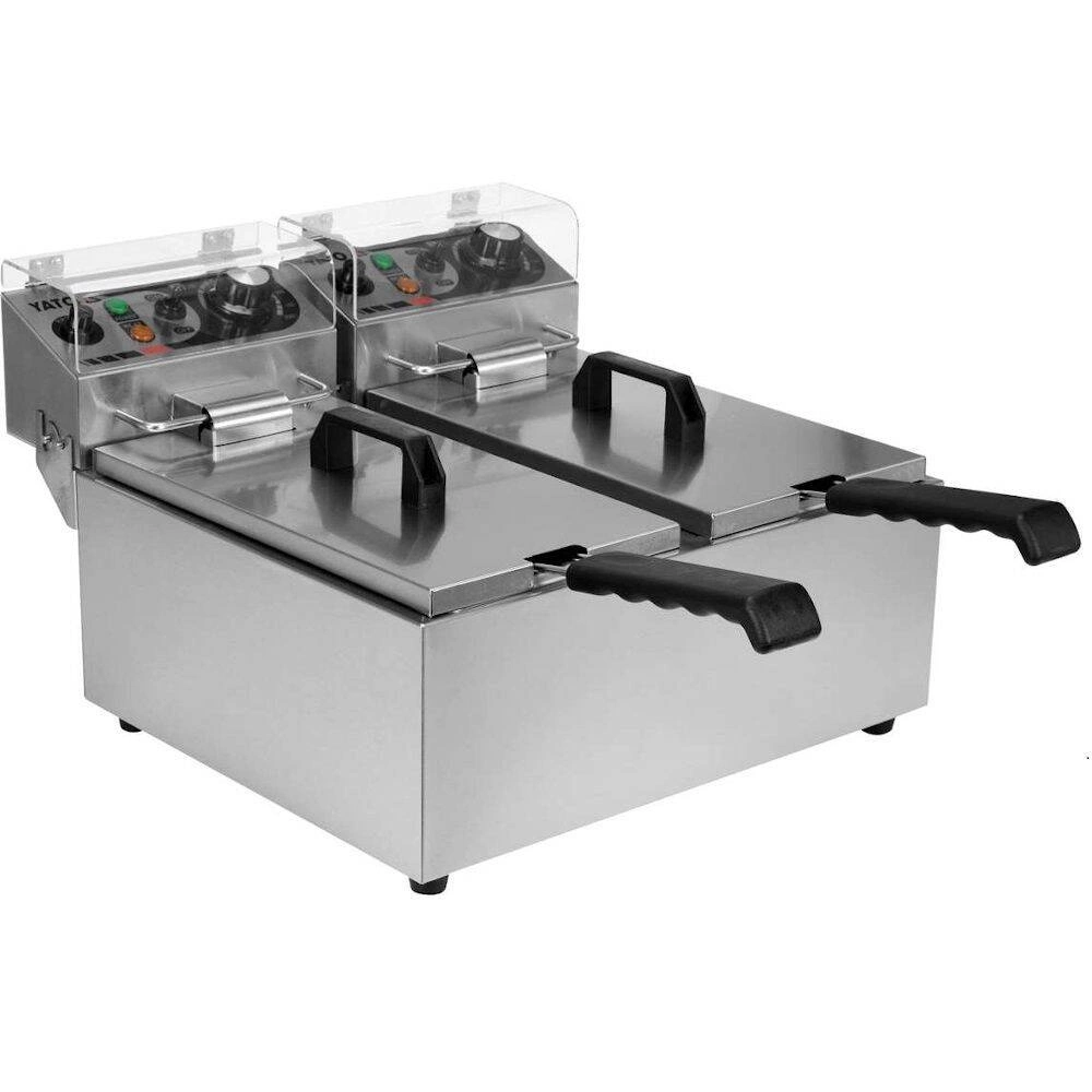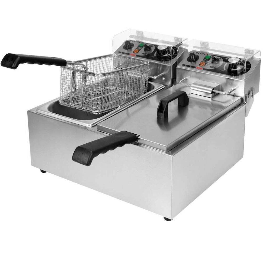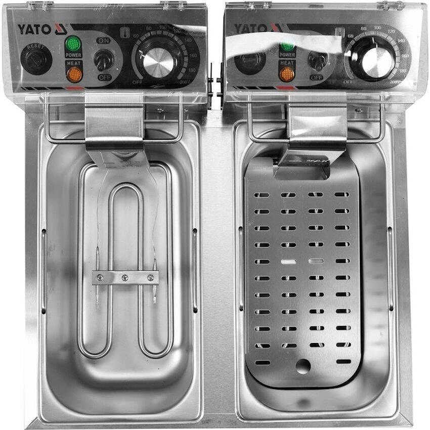Dvoukomorová fritéza o objemu 2x3,5L značky YATO. Je určena pro smažení v hlubokém tuku: hranolky, maso, ryby, krokety, zelenina. Nádrže fritézy mají celkový objem 6L. Minimální hladina oleje je 2,5L a maximální 3,5L.