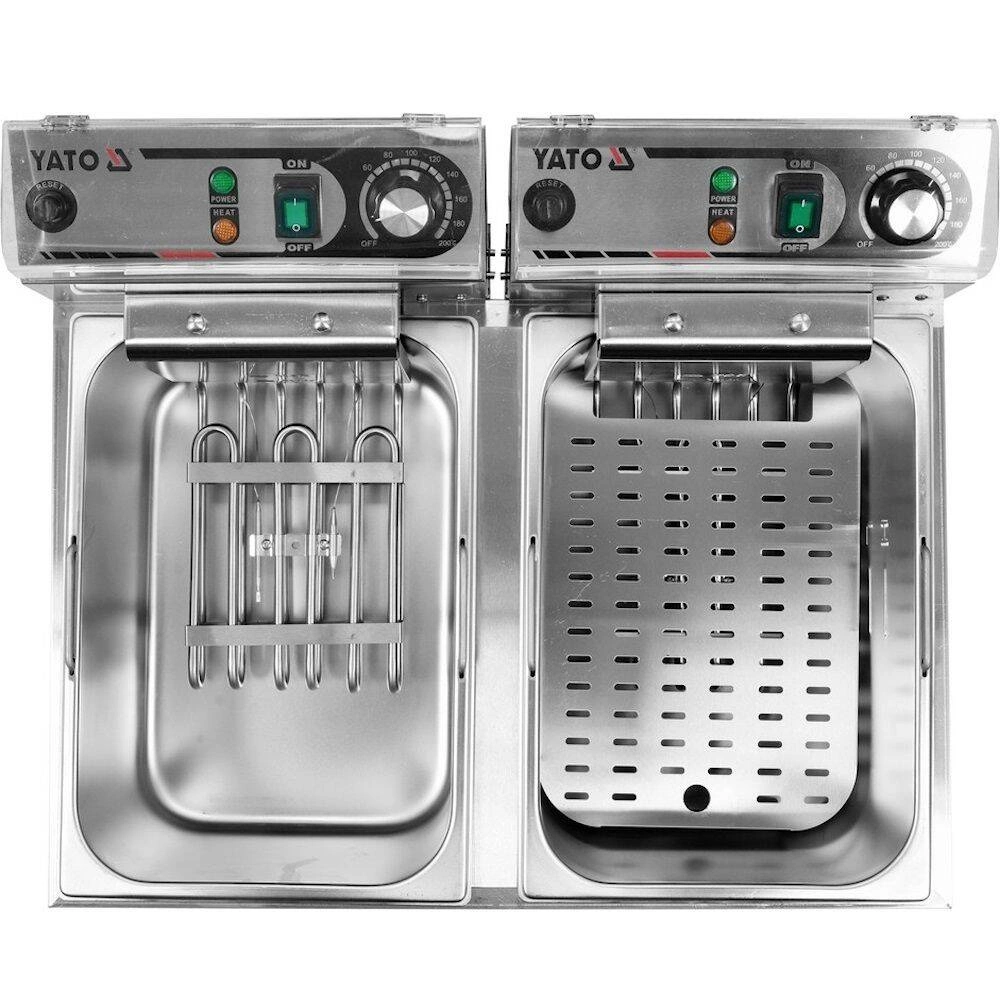 Dvoukomorová fritéza o objemu 2x11,5L značky YATO. Je určena pro smažení v hlubokém tuku: hranolků, masa, ryb, kroket, zeleniny. Nádrže fritézy mají celkový objem 17L. Minimální hladina oleje je 6,5L a maximální 11,5L.
