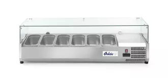 Chladicí stojany s kapacitou 6 GN 1/3 s rovným skleněným okénkem z tvrzeného skla. Pouzdro z nerezové oceli. Automatické odmrazování. Digitální displej a elektronický termostat. Statické chlazení. Automatické odmrazování. Klimatická třída 4. Bezproblémový provoz nástavce při okolní teplotě do +32oC a vlhkosti do 60 %. Průměrná denní spotřeba elektrické energie 3 kW.