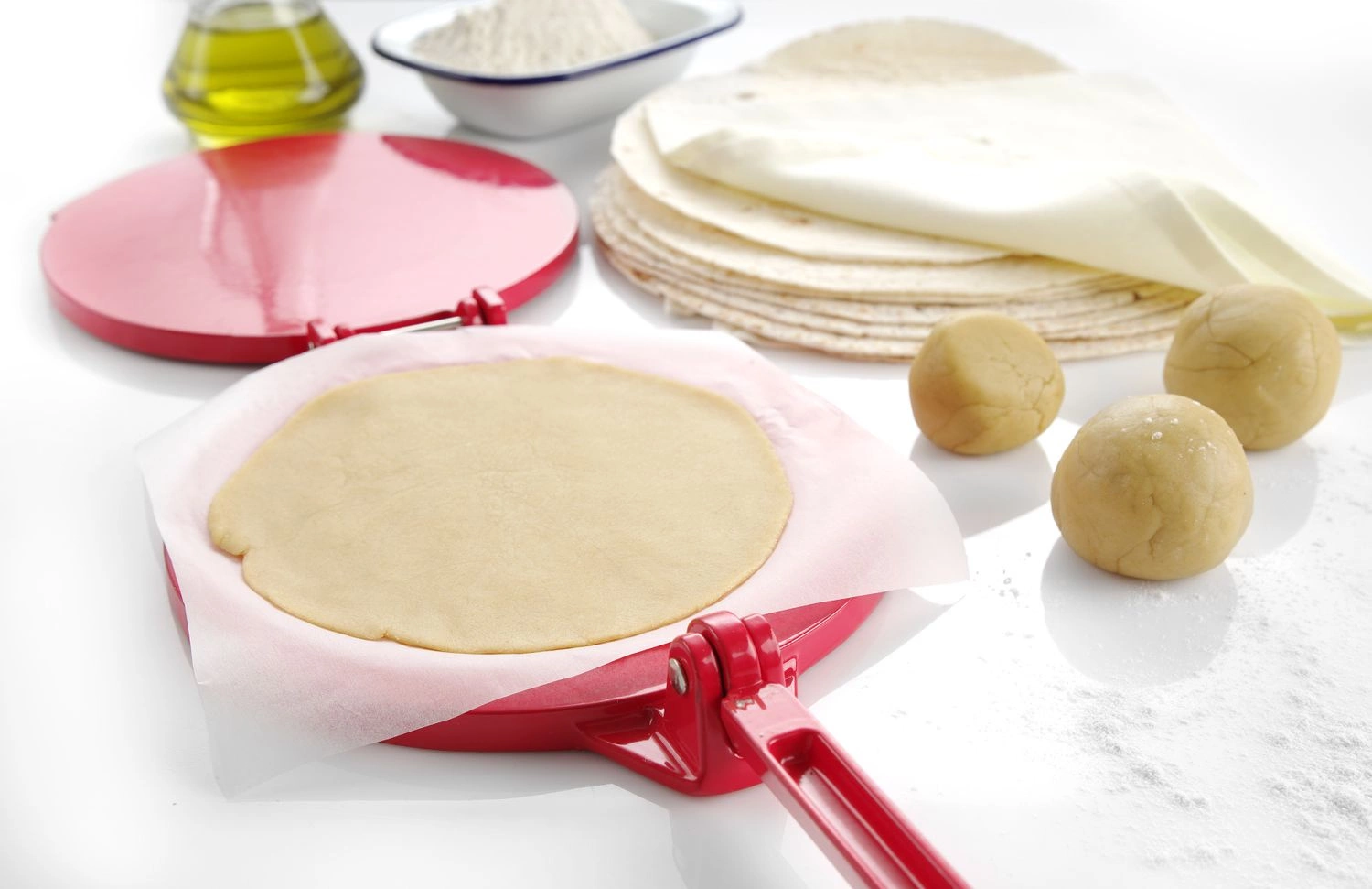 Ruční lis na tortilly. Maximální průměr tortilly 20 cm. Vyrobeno z hliníkové slitiny s práškovým nástřikem v červené barvě.