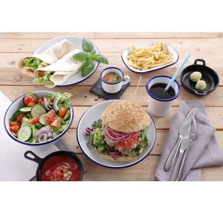400 ml hrnek. Vyrobeno z vysoce kvalitní oceli potažené bílým smaltem s modrým okrajem. Lze stohovat, lze mýt v myčce nádobí. Nepoužívejte v mikrovlnné troubě.