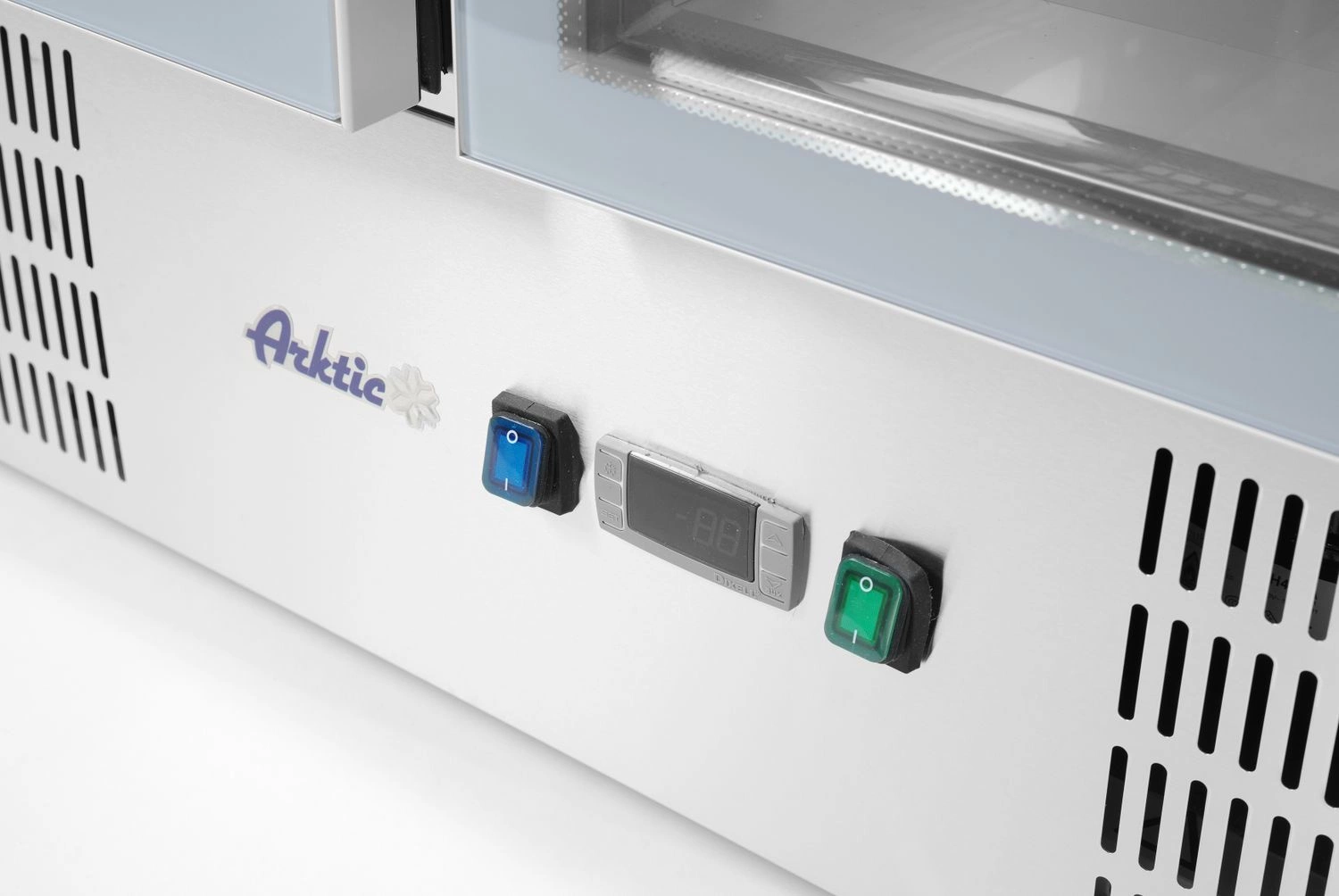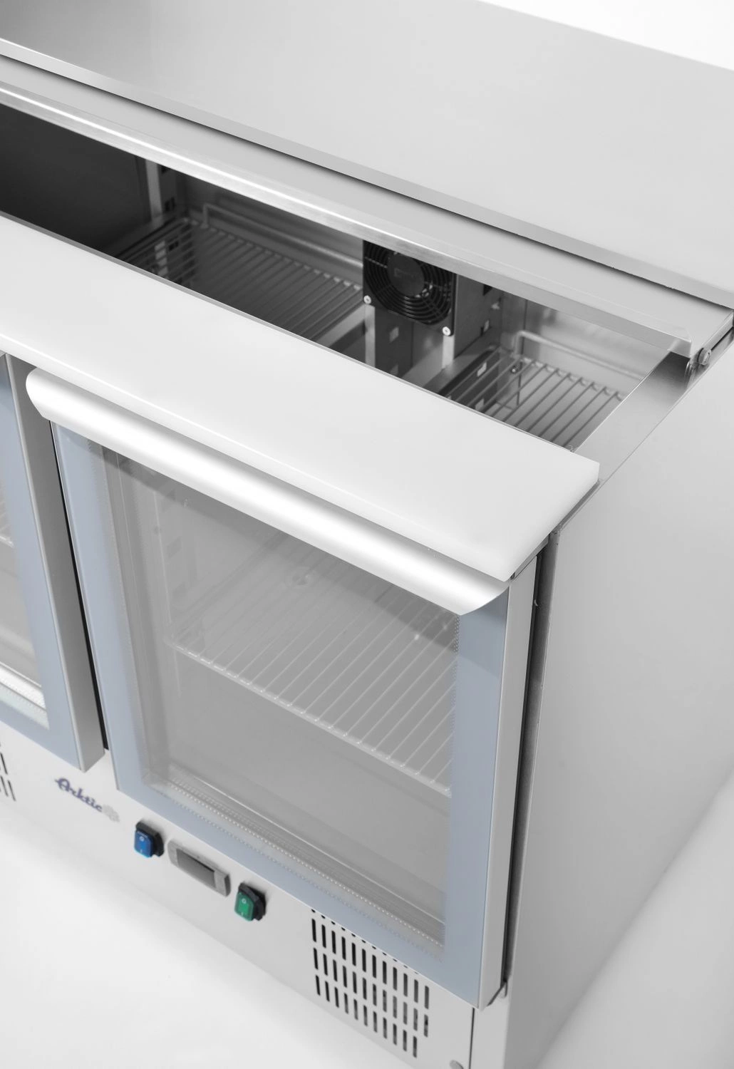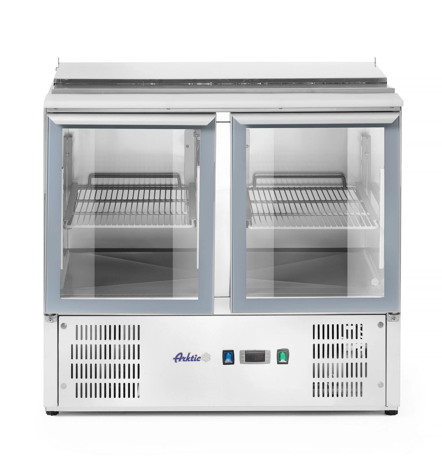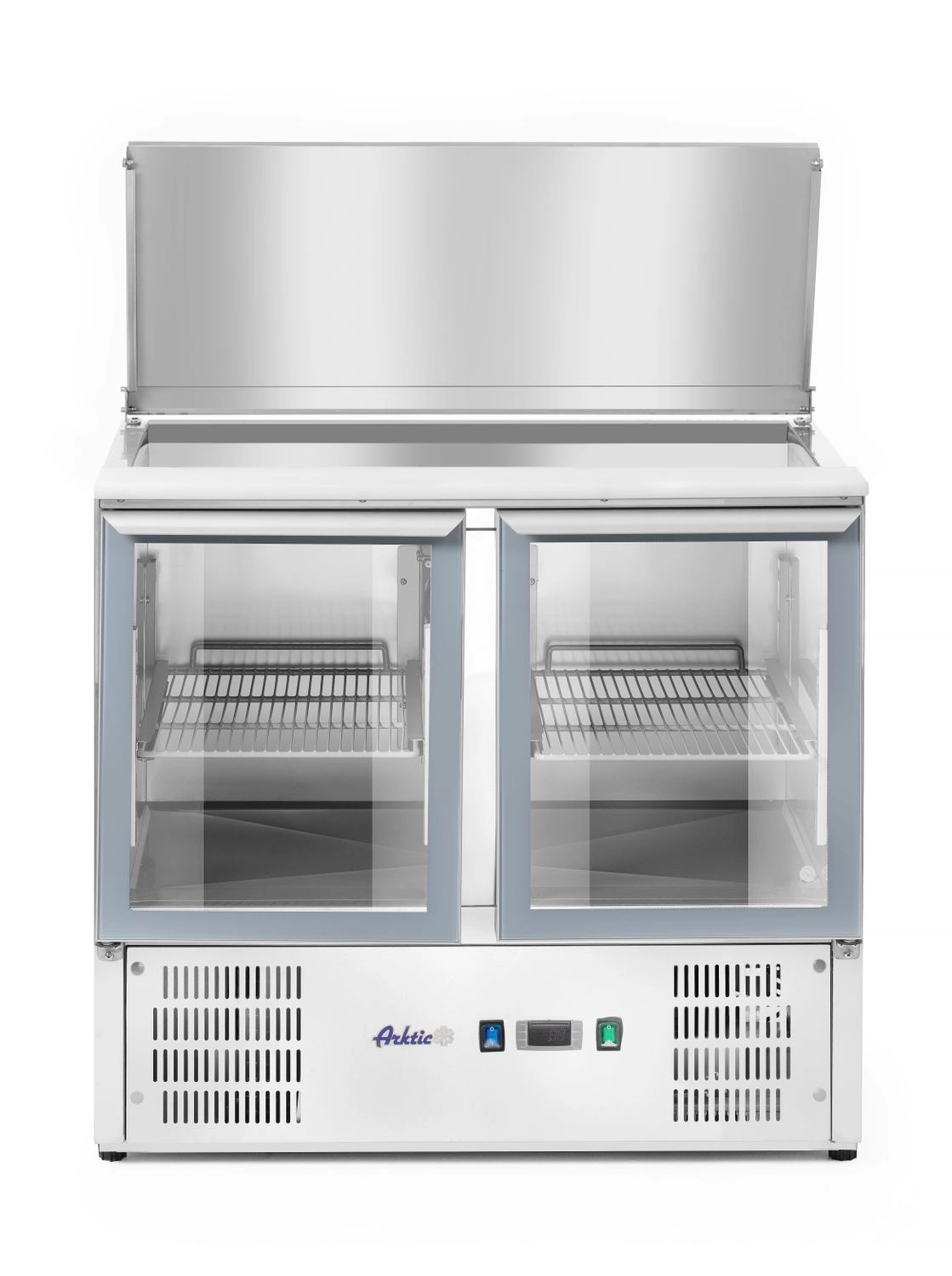 Dvoudveřový chladicí box na salát Značka Arktic s výklopným víkem. Prosklené dveře. Plášť je vyroben z vysoce kvalitní nerezové oceli AISI 201. Výklopné víko umožňuje přikrýt GN nádoby a lze jej použít jako přídavnou horní část. Statické chlazení podporované vnitřním ventilátorem. Jednotka se montuje zespodu. Automatické odpařování kondenzátu, které zvyšuje účinnost elektro. Krájecí část stolní desky je vyrobena z polyethylenu. Ergonomická rukojeť pro otevírání dvířek. 4 nós z plastu.