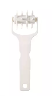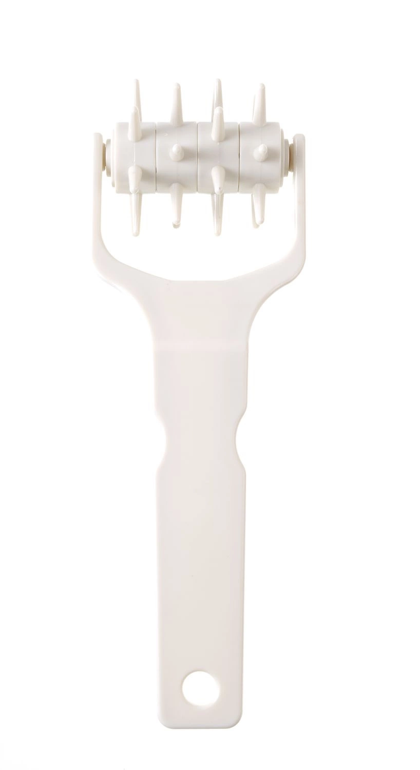 Profesionální děrovací váleček na těsto 7,7x21 cm.Nepostradatelný atribut cukráře, ideální i pro domácí pečení. Váleček o šířce 6 cm s 32 dlouhými, pevnými plastovými hroty na napichování těsta. Ideální pro odvětrávání křehkého těsta a těsta na pizzu. Zabraňuje vzniku vzduchových bublin a zajišťuje lepší výsledky pečení.