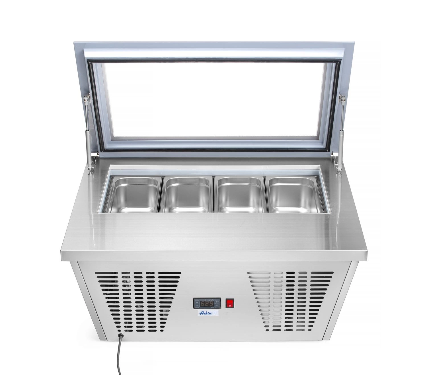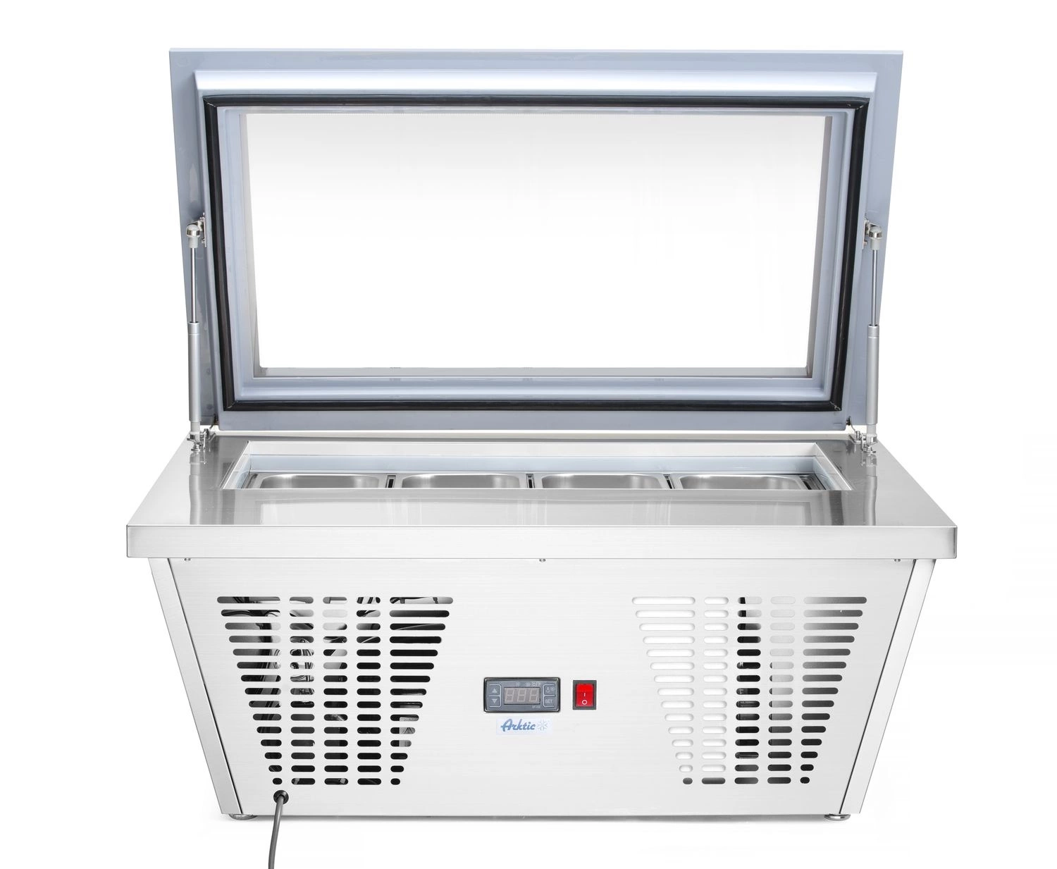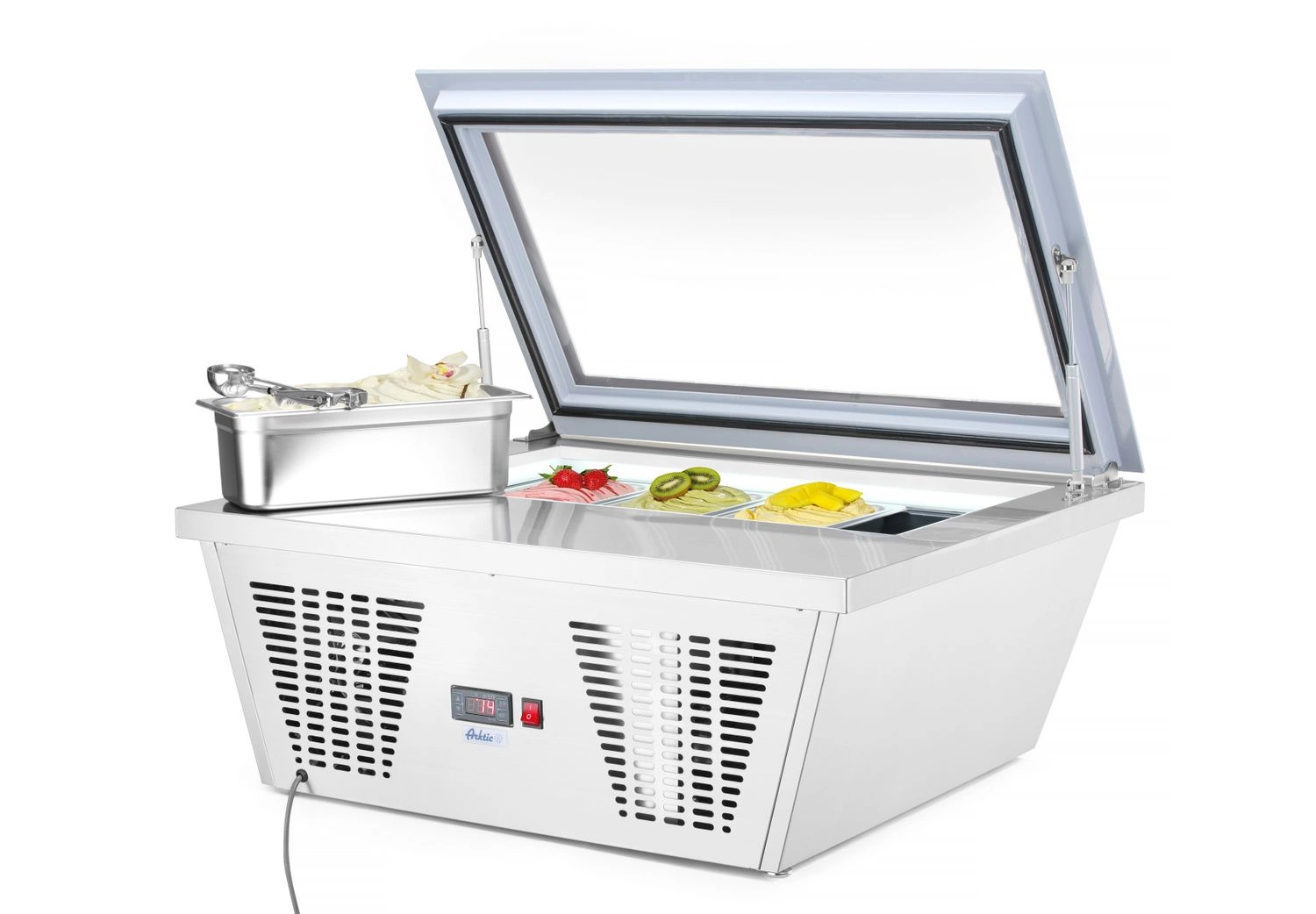 Kapacita - 4 zásobníky na zmrzlinu o rozměrech 36x16,5x12 cm. Digitální displej, elektronický termostat. Přímé statické chlazení, s automatickým odmrazováním. Teplotní rozsah -24/-20°C. Výškově nastavitelné nožičky.