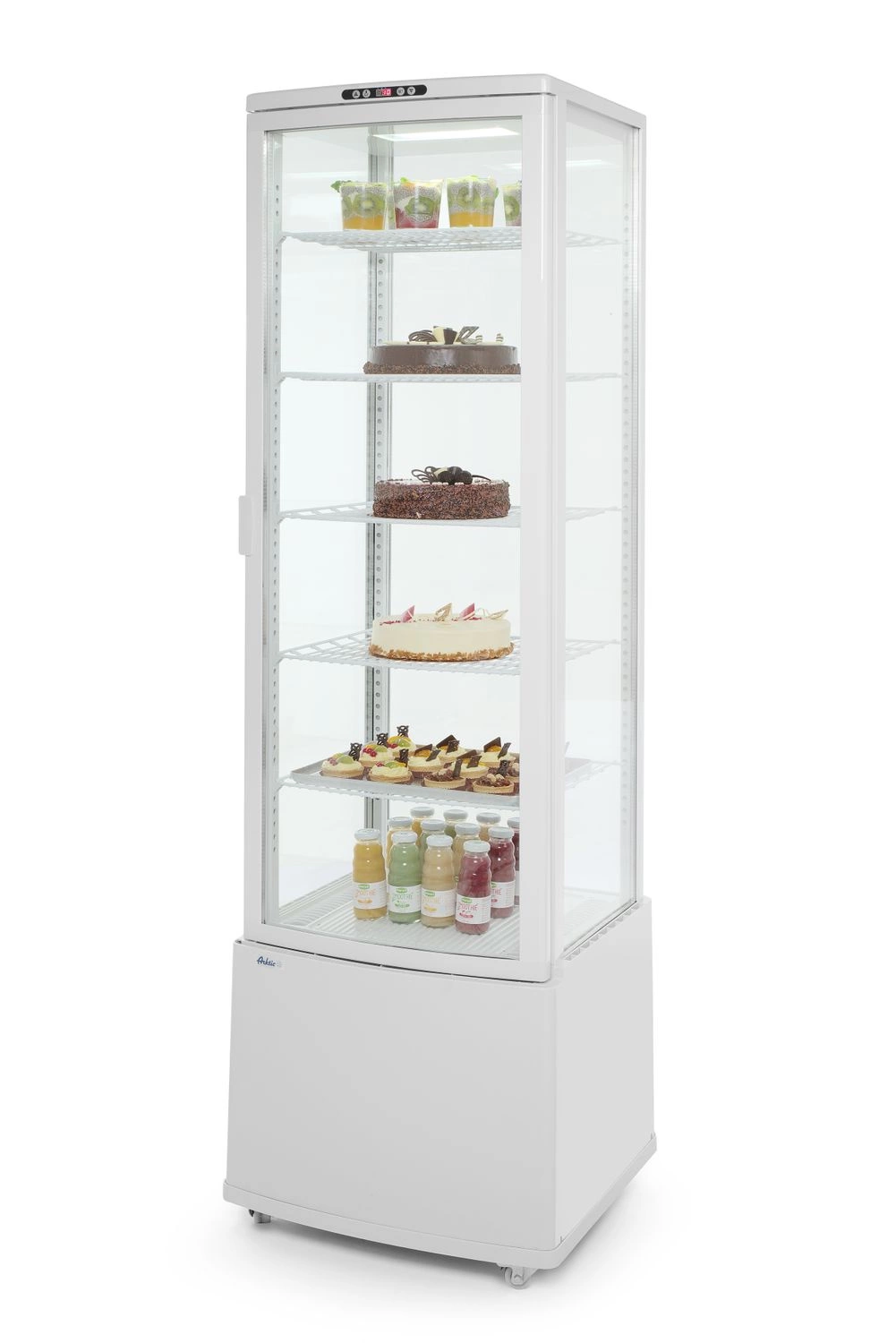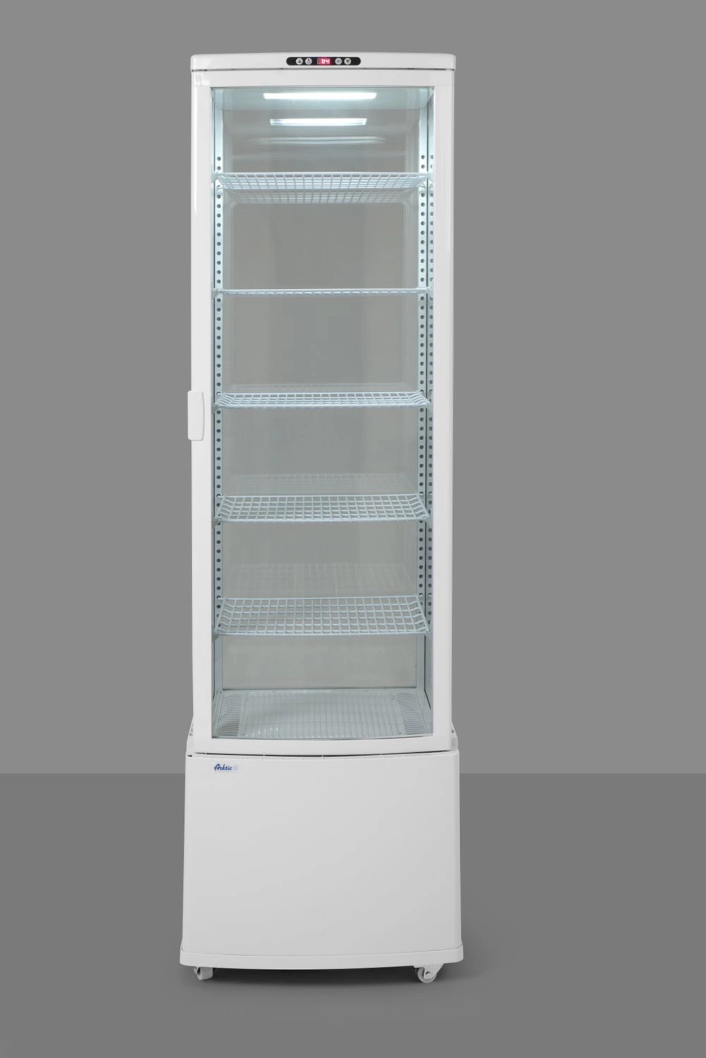 Chladicí vitrína o objemu 280 litrů. . Kryt z lakované nerezové oceli. Podsklepená vitrína se snadno otevíratelnými ohýbanými křídlovými dvířky. Vzduchový kanálek na vnější straně skla pro odvod a prevenci kondenzace. Vnitřní osvětlení na góřadě komory. Pět nastavitelných ocelových póů, potažených PVC v bílé barvě.