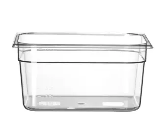 GN kontejner z 1/2 polykarbonátu o hloubce 15 cm. Vyrobeno z vysoce kvalitního průhledného polykarbonátu. Nepohlcuje příchutě ani pachy.