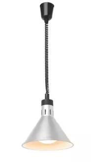 Lampa na ohřívání potravin ve stříbrné barvě. Díky nastavitelné šňůře lze ohřívací lampu snadno umístit. Délka kabelu se pohybuje od 70 do 150 cm.