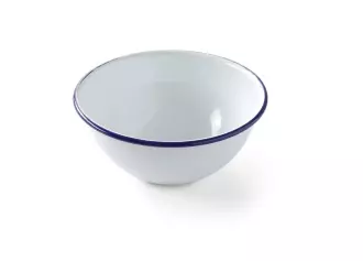 Průměr mísy 16 cm. . Vyrobeno z vysoce kvalitní oceli potažené bílým smaltem s modrým okrajem. Možnost stohování, lze mýt v myčce. Nepoužívejte v mikrovlnné troubě.