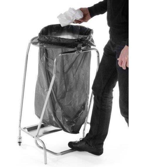 Stojan na pytle na odpad. . Rám z nerezové oceli. Vybaveno nožním tlačítkem pro otevření brašny a 2 kócky s brzdami.