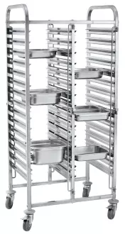 Podsedlový vozík pro přepravu kontejnerů GN Je vybaven 4 otočnými kolečky (2 s brzdou). Pojme až 30 nádob GN 1/1 - vzdálenost mezi policemi 80 mm. Kontejner je na obou stranách zajištěn proti vysunutí. Kontejnery lze zasunout do sebe pro snadné skladování.
