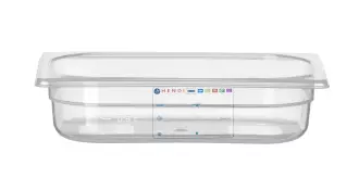 Nádoba GN 1/4 HACCP o hloubce 6,5 cm z průhledného polypropylenu.  Vložený štítek pro sledování procesu skladování. Nepohlcuje pachyóa příchutěóa.