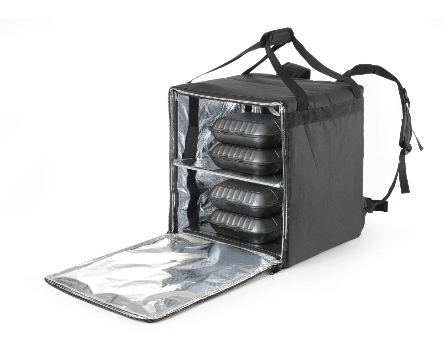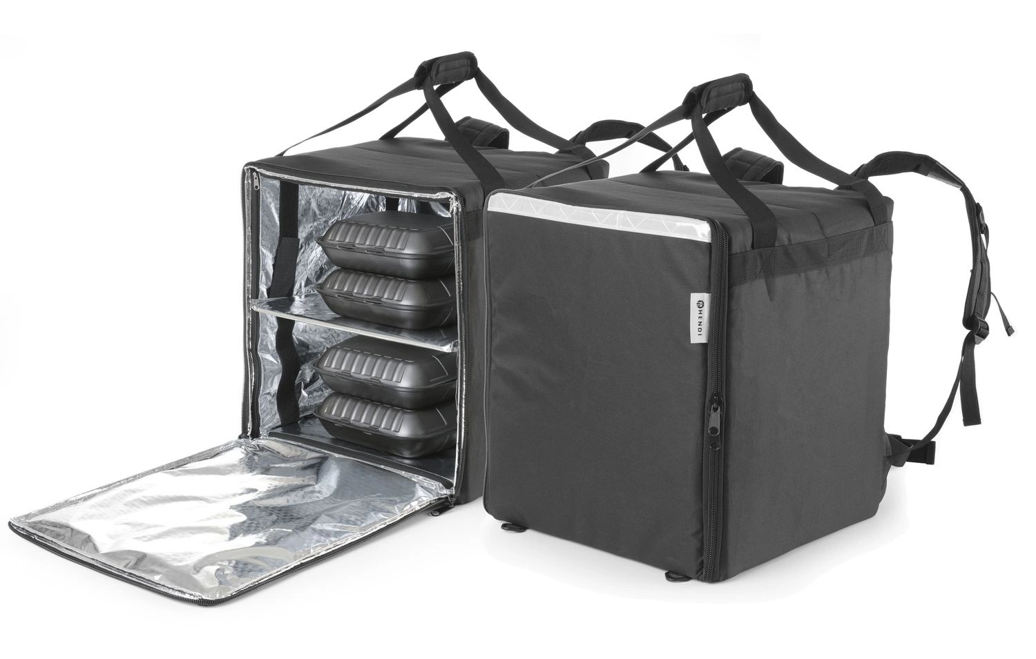 Taška značky Hendi na přepravu pizzy. Vyrobeno z polyesteru. Obsahuje průhlednou kapsu na účtenky. Vyjímatelná výztužná podložka. Do přihrádky se vejde až 10 krabic na pizzuós. Lze použít také jako batoh.