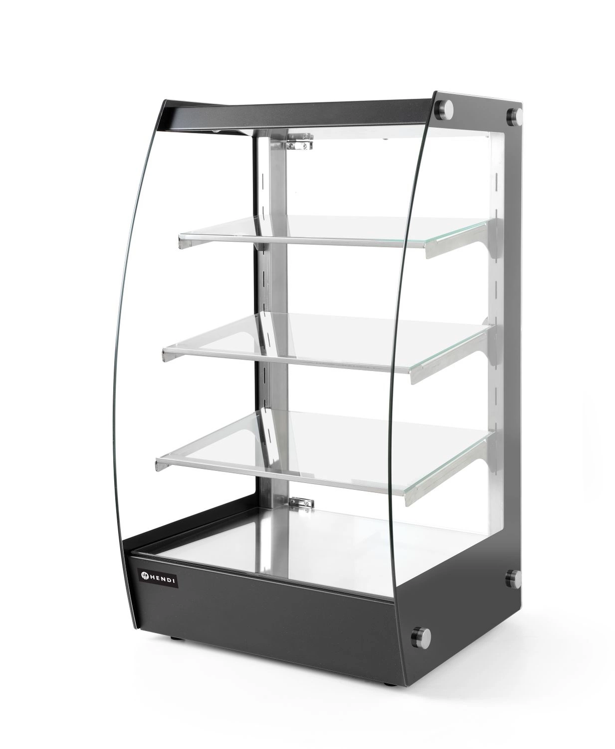 Díky napájení 230 V a kompaktnímu designu lze vitrínu postavit prakticky kdekoli. Osvětlení LED umístěný na góth ovládaný osvětleným spínačem. Kryt z nerezové oceli a tvrzeného bezpečnostního skla. Boční sklo o tloušťce 5 mm. Absence čelního skla umožňuje samoobsluhu. Praktický spodní výklenek o rozměrech 26x32x8,5 cm, např. pro uložení zásob do vitríny. Tři nastavitelné skleněné police nakloněné pod mírným úhlem směrem k zákazníkovi. 8 možných poloh skleněných polic.