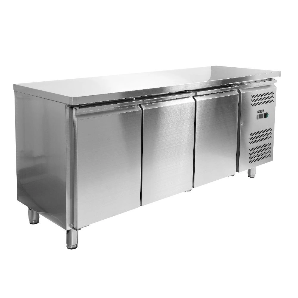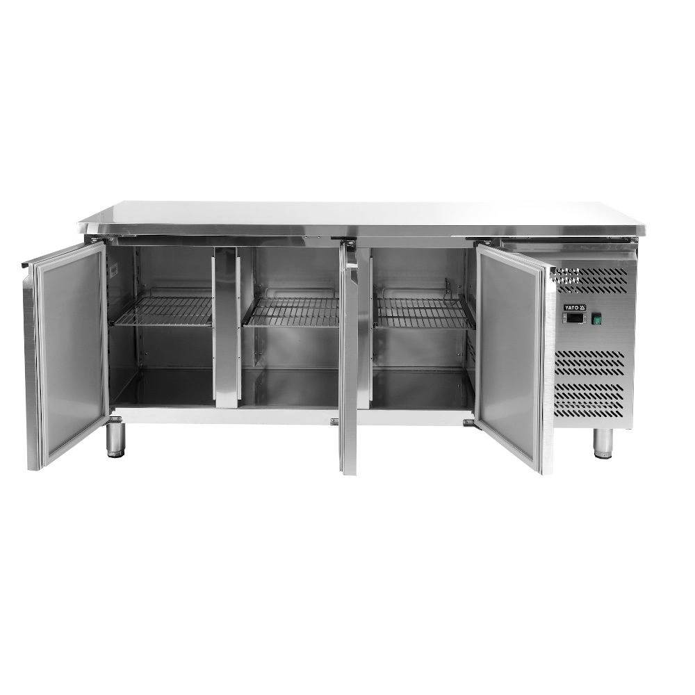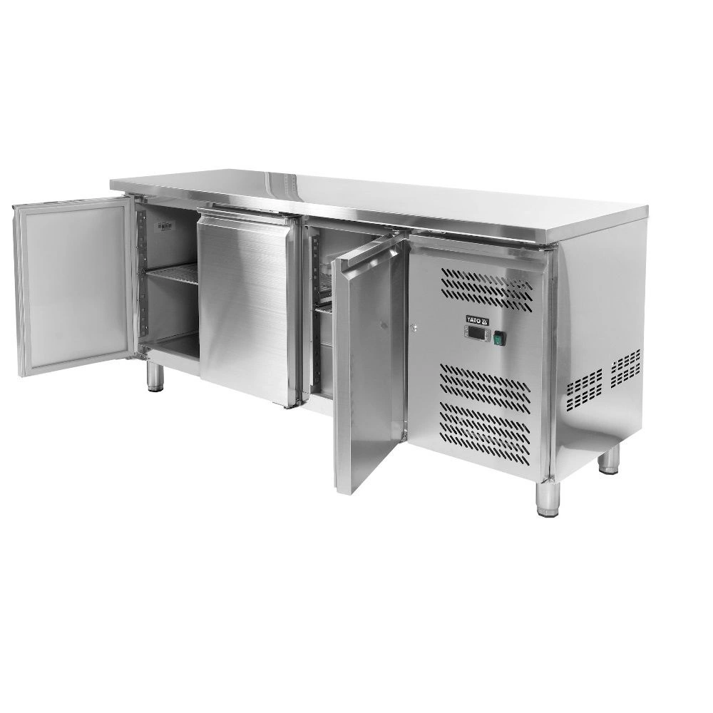 Chladicí stůl 3-dveřový značky YATO - řada 600 o rozměrech 179,5x60 cm a nastavitelné výšce 84,5-91,5 cm. Objem 339 l. Plášť a pracovní deska jsou vyrobeny z nerezové oceli ss201. Samozavírací dveře. Vybavení zahrnuje 3 roštové police (každá na jedny dveře) potažené PVC s maximální nosností 40 kg - při rovnoměrném zatížení, o rozměrech 33x42,5 cm. Nastavitelná výška polic - 11 úrovní. Zařízení je snadné na údržbu díky tomu, že je umístěno na nožičkách, což umožňuje snadné čištění také pod zařízením.