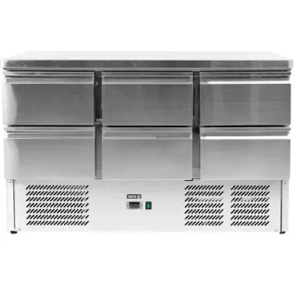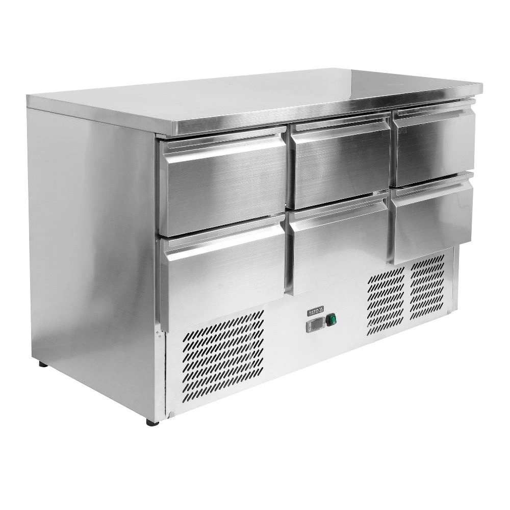 Chladicí stůl se 6 zásuvkami značky YATO - řada 700 s pracovní deskou o rozměrech 1365x700mm a celkovým objemem 368 l. Vnitřní i vnější plášť a pracovní deska jsou vyrobeny z vysoce kvalitní nerezové oceli SS201. Celková výška stolu je 88 cm, z čehož nožky mají výšku 2 cm a nejsou výškově nastavitelné. Zásuvky pojmou GN 1/1 nádoby a lahve o maximální výšce 15,5 cm. Díky otvorům v bočních stěnách zásuvek je umožněna volná cirkulace vzduchu. Zásuvky jsou namontovány na kolejnicích s kuličkovými ložisky, což umožňuje jejich plné vysunutí a vyjmutí například pro mytí. Vyměnitelné magnetické těsnění zaručuje těsné uzavření. Chladicí agregát o výkonu 240 W využívá chladivo R290, je určen pro provoz ve 4. klimatické třídě - při maximální okolní teplotě 30o C a relativní vlhkosti 55 %. Zařízení má elektronický ovladač s digitálním displejem teploty.
