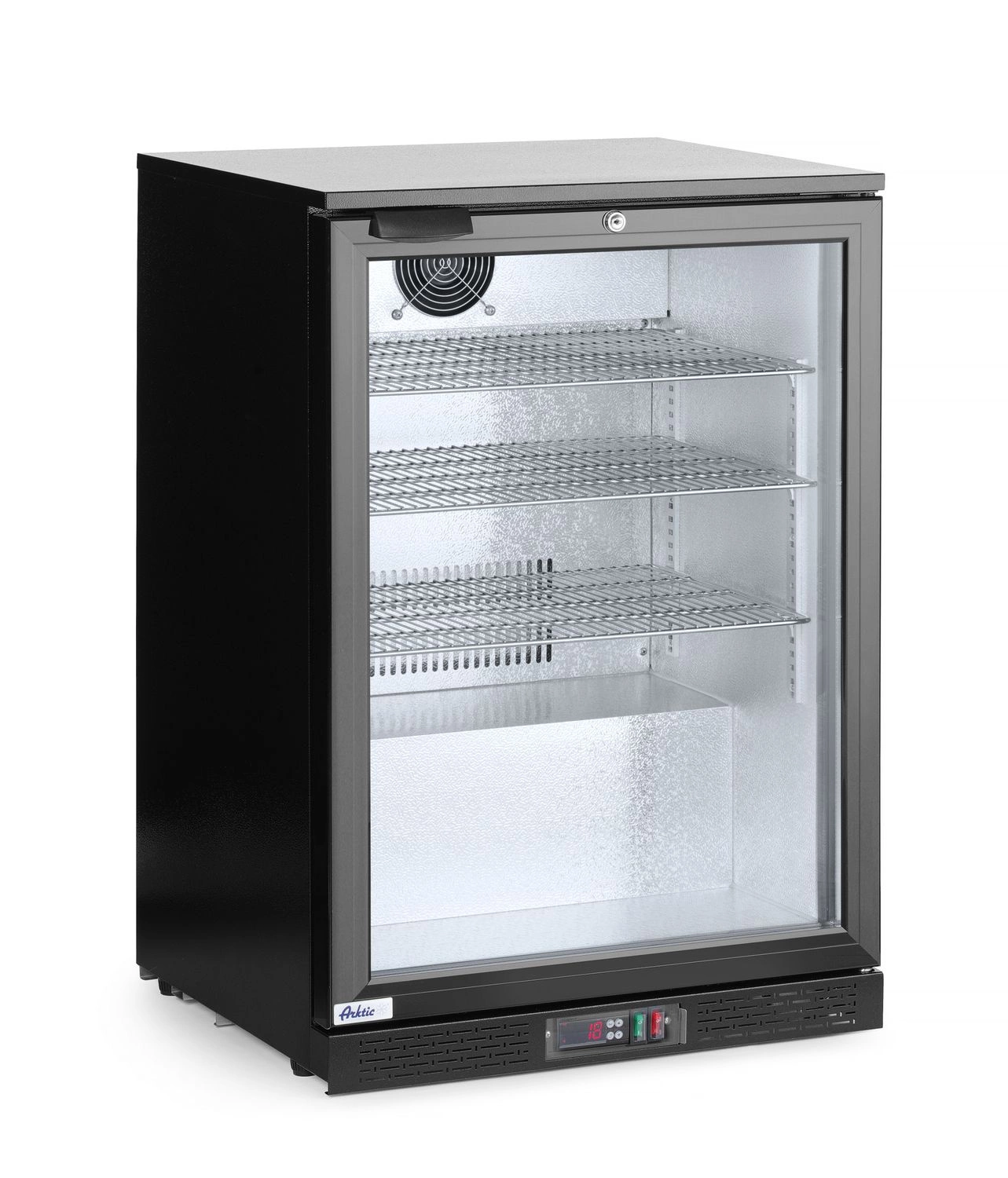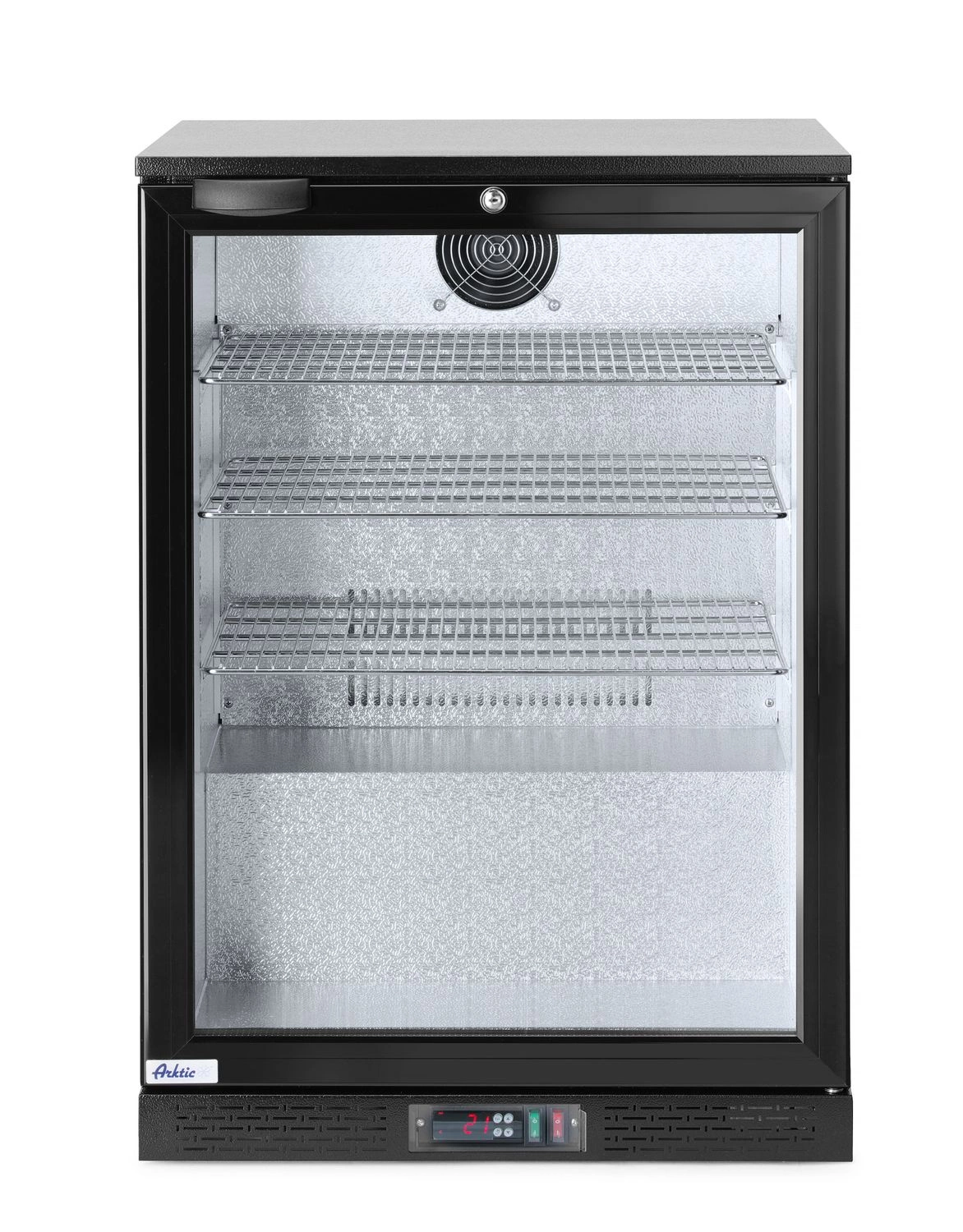 Barová lednice o objemu 138 litrů na lahvové nápoje. . Chladnička je vybavena 3 chromovanými pó³³. LED osvětlením v prostoru. Elektronický termostat. Digitální ukazatel teploty. Statické chlazení, kterému navíc napomáhá ventilátor. Ocelový kryt s černým práškovým nástřikem. Dveře z tvrzeného skla v plastovém rámu se zámkem. Vnitřek komory z extrudovaného hliníku. Agregát umístěný pod komorou.