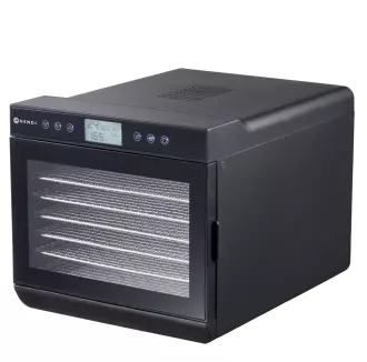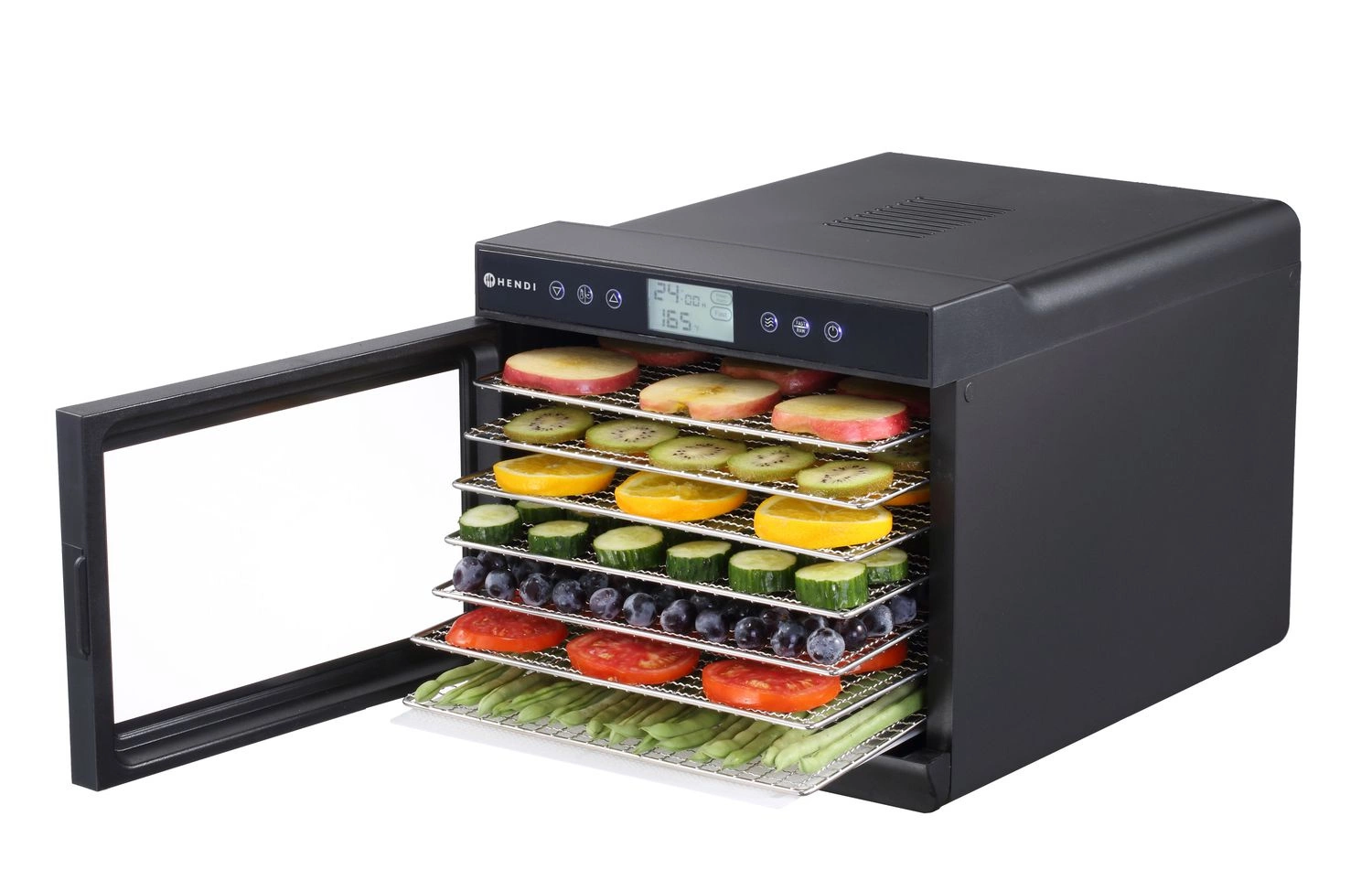 Sušička potravin Kitchen Line Hendi. Pouzdro je vyrobeno z polypropylenu. Dvojitá stěna pro zvýšení tepelného výkonu. Pro sušení ovoce, zeleniny, bylinek, masa, ryb atd. Teplý vzduch rozváděný tichým ventilátorem zajišťuje rovnoměrný sušící účinek, aniž byste museli otáčet tácy. Dodává se se 7 nerezovými rošty o velikosti 37,5×30 cm, každý s maximální nosností 500 gramů. Rošty jsou rozmístěny každých 35 cm. Snadno se čistí. Průhledná dvířka umožňují pozorování procesu sušení.