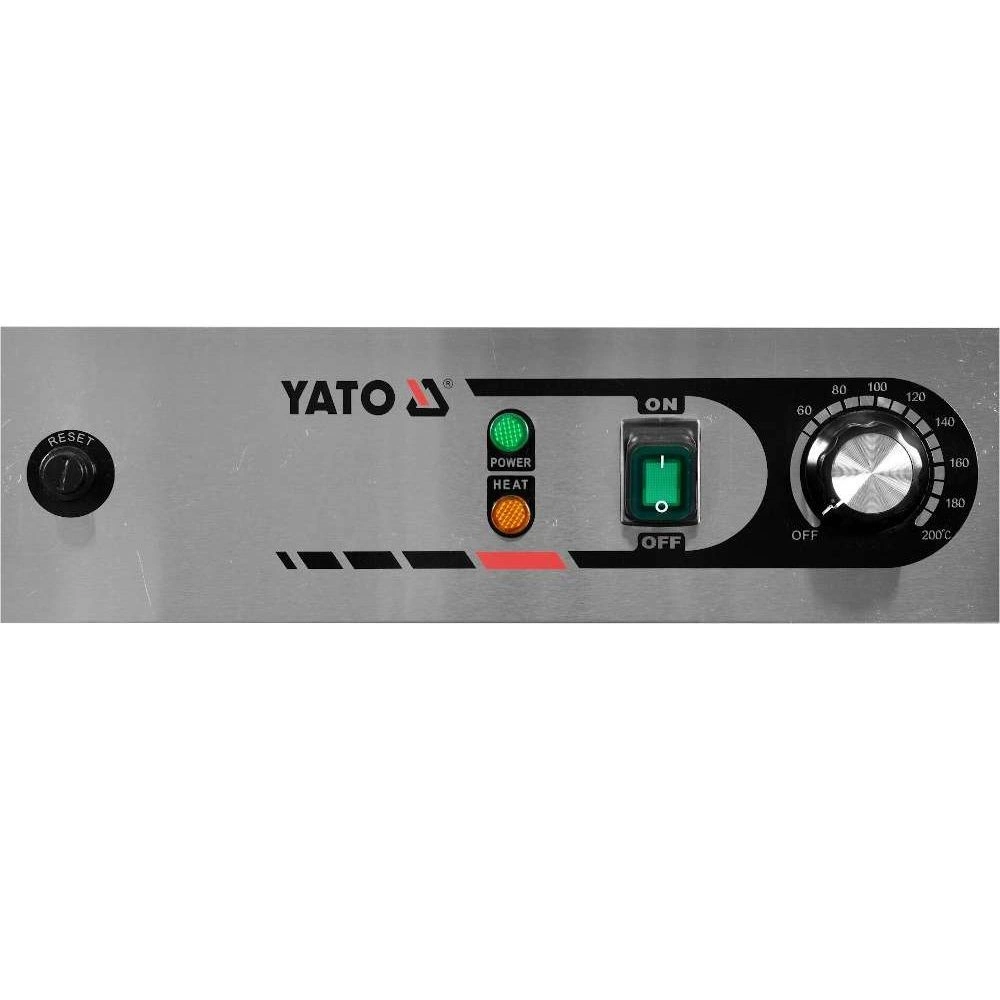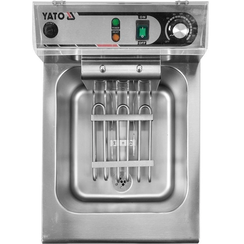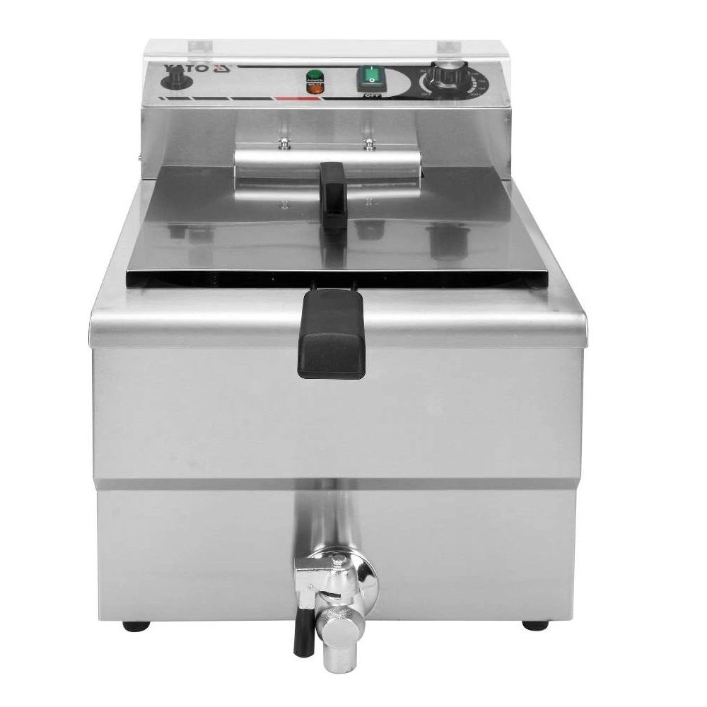 Fritéza s 1 komorou s vypouštěcím kohoutem o objemu 12L značky YATO. Je určena pro smažení v hlubokém tuku: hranolků, masa, ryb, krokety, zeleniny. Nádrž fritézy má celkový plnicí objem 16L. Minimální hladina oleje je 9L a maximální 12L.