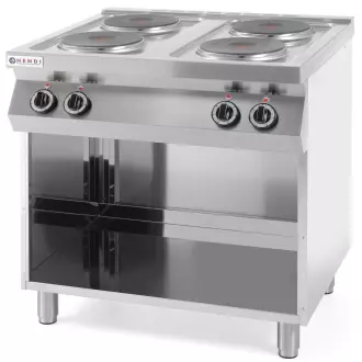 Kitchen Line 4 plotýnkový elektrický sporák. . Pracovní deska z nerezové oceli AISI 304. Boční kryt z nerezové oceli AISI 430. Skříňka uzavřená ze 3 stran s vnitřními rozměry 798x570x(V)470 mm. Litinové varné desky: 4x ø220 mm každá 2,6 kW. Nastavitelné ocelové nónožičky 100-165 mm.