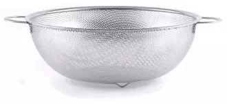 Sítko o průměru 31,5 cm se 2 držadly a podstavcem. Vyrobeno z nerezové oceli. Lze mýt v myčce nádobí.
