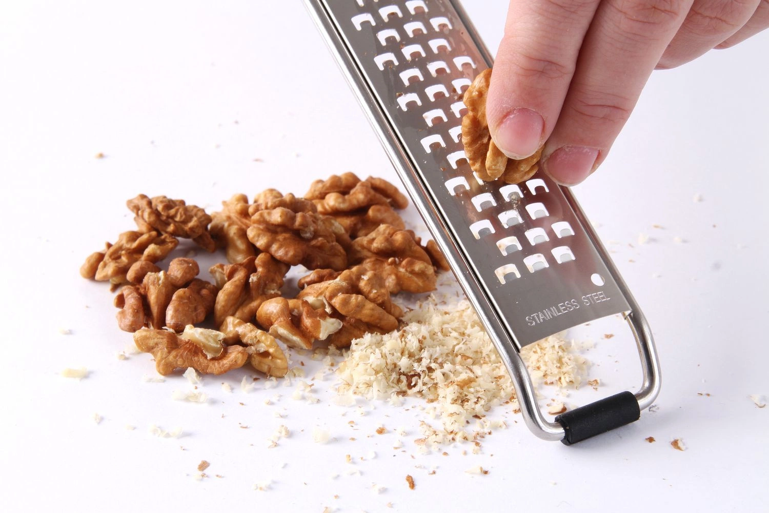Úzké ruční struhadlo se středními oky Na konci je protiskluzová gumička, která usnadňuje práci. Vyrobeno z nerezové oceli (struhadlo) a plastu (rukojeť).