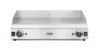 Grilovací deska s chromovanou pracovní plochou Tloušťka 9 mm. Pracovní deska je z 1/3 vlnitá, ze 2/3 hladká. Kryt - z nerezové oceli. Dvě nezávisle řízené topné zóny. Kontrolka zabraňující náhodnému kontaktu s varnou deskou. Vyjímatelná zásuvka na tuk a zbytky z grilu. Stupňovitá regulace teploty až do 300 °CoC. Ochrana proti přehřátí. Lze použít pro nepřetržitý provoz.
