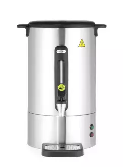 Kávovar Concept Line o objemu 13 l. . Tělo z nerezové oceli. Víko a rukojeti z polypropylenu. Varná konvice je vybavena nekapajícím kohoutkem a skleněným ukazatelem hladiny vody. Světelný indikátor vás informuje o ukončení ohřevu a o nutnosti sejmout vodní kámen. Díky vestavěnému filtru na hrubě mletou kávu, papírovému filtr není nutný. Kávovar udržuje teplotu kávy. Odkapávací miska je připevněna magnetem, což usnadňuje její čištění.
